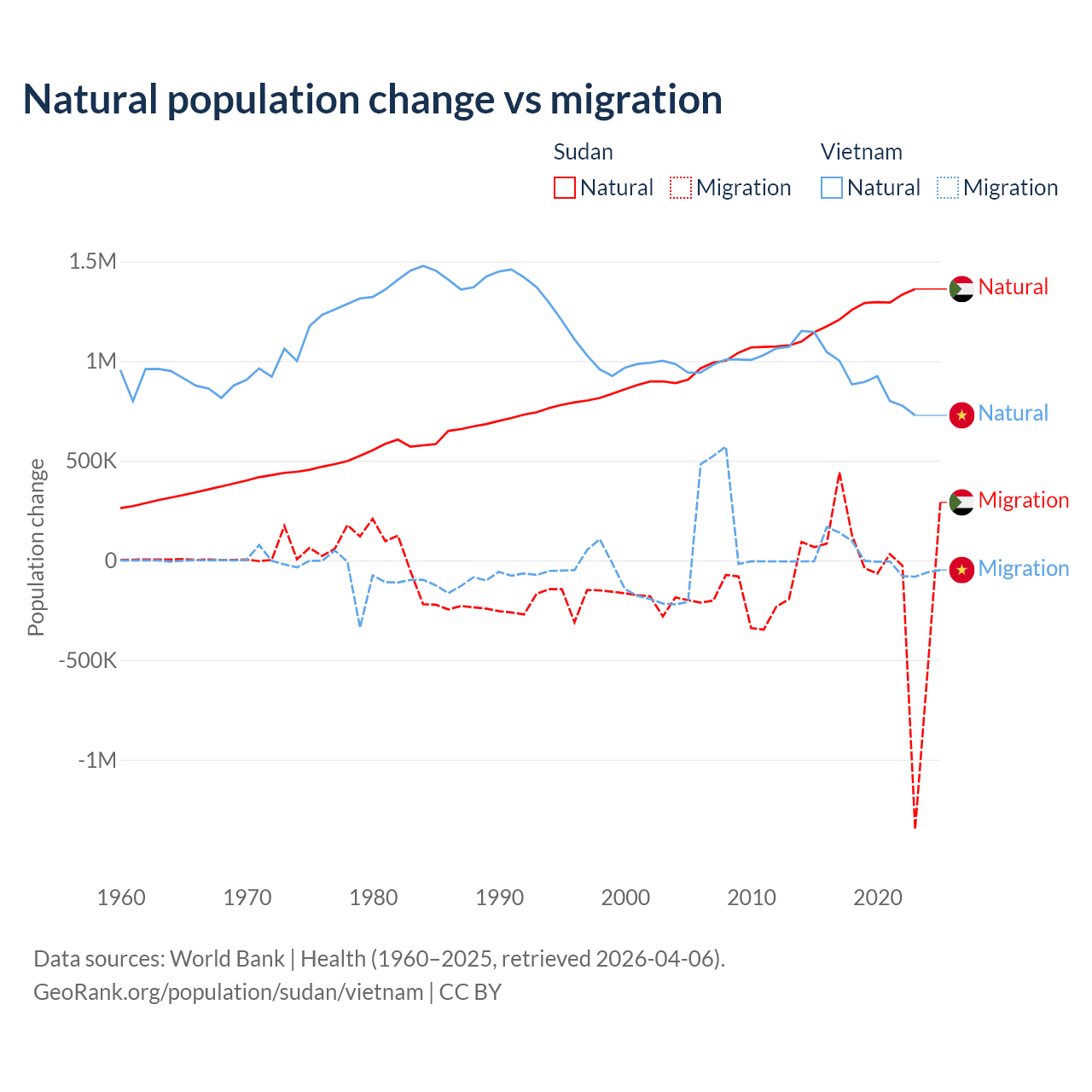 Over the last 10 years, 95.1% of the population change in Sudan is from natural causes (a gain of 12,459,977 people) and 4.88% is from migration (a loss of 639,596 people). In Vietnam 97.7% is from natural causes (a gain of 9,349,756 people) and 2.29% is from migration (a gain of 219,073 people).
