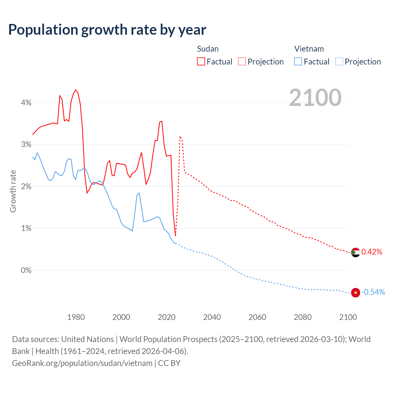 Data sources: World Bank | Health (1960–2024, retrieved 2026-04-06); United Nations | World Population Prospects (1960–2026, retrieved 2026-03-10); U.S. Census Bureau (1960–2025, retrieved 2026-02-08); Central Intelligence Agency (CIA) (2000–2019, retrieved 2026-02-20).