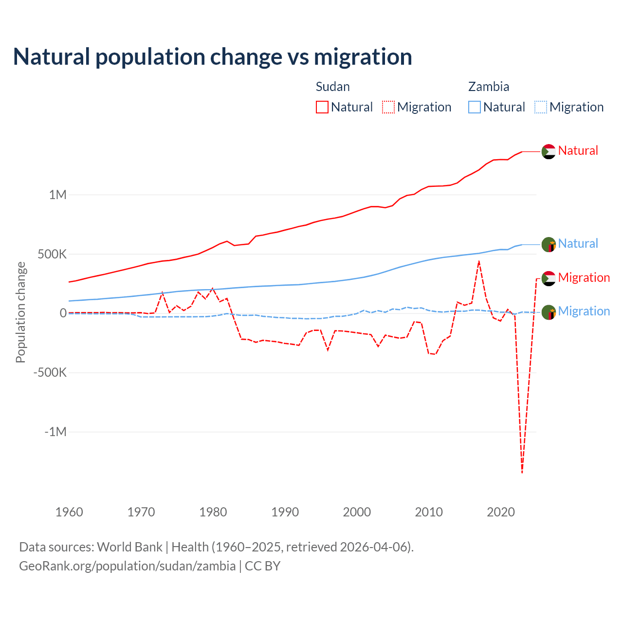 Over the last 10 years, 95.1% of the population change in Sudan is from natural causes (a gain of 12,459,977 people) and 4.88% is from migration (a loss of 639,596 people). In Zambia 97.4% is from natural causes (a gain of 5,233,797 people) and 2.58% is from migration (a gain of 138,554 people).