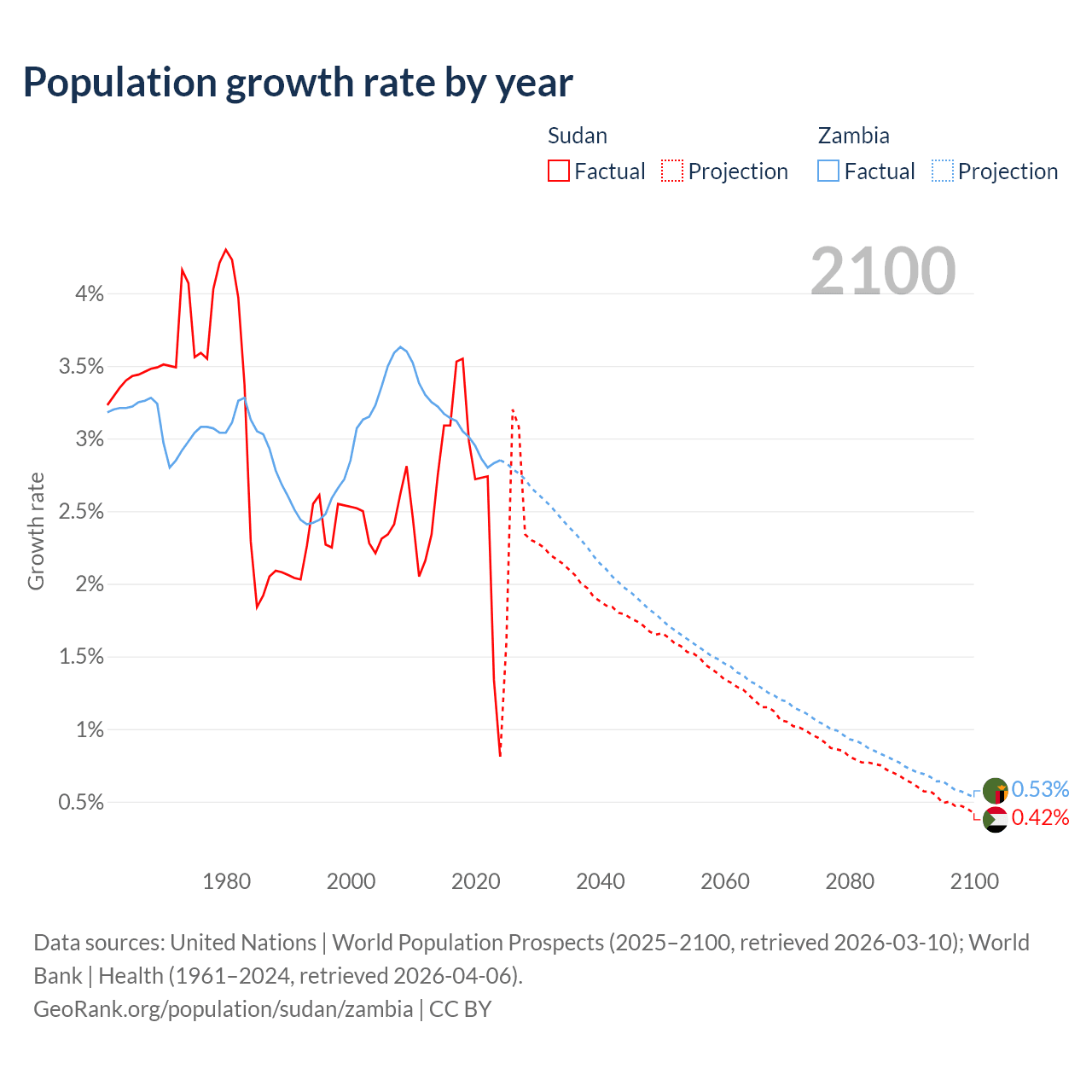 - For the last 10 years, Sudan has had an average growth rate of +2.67% per year vs +3% in Zambia.