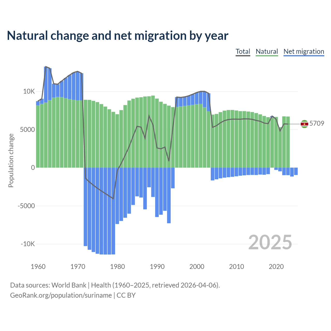Over the last 10 years, 90.3% of the population change in Suriname is from natural causes (a gain of 66,709 people) and 9.72% is from migration (a loss of 7,185 people).