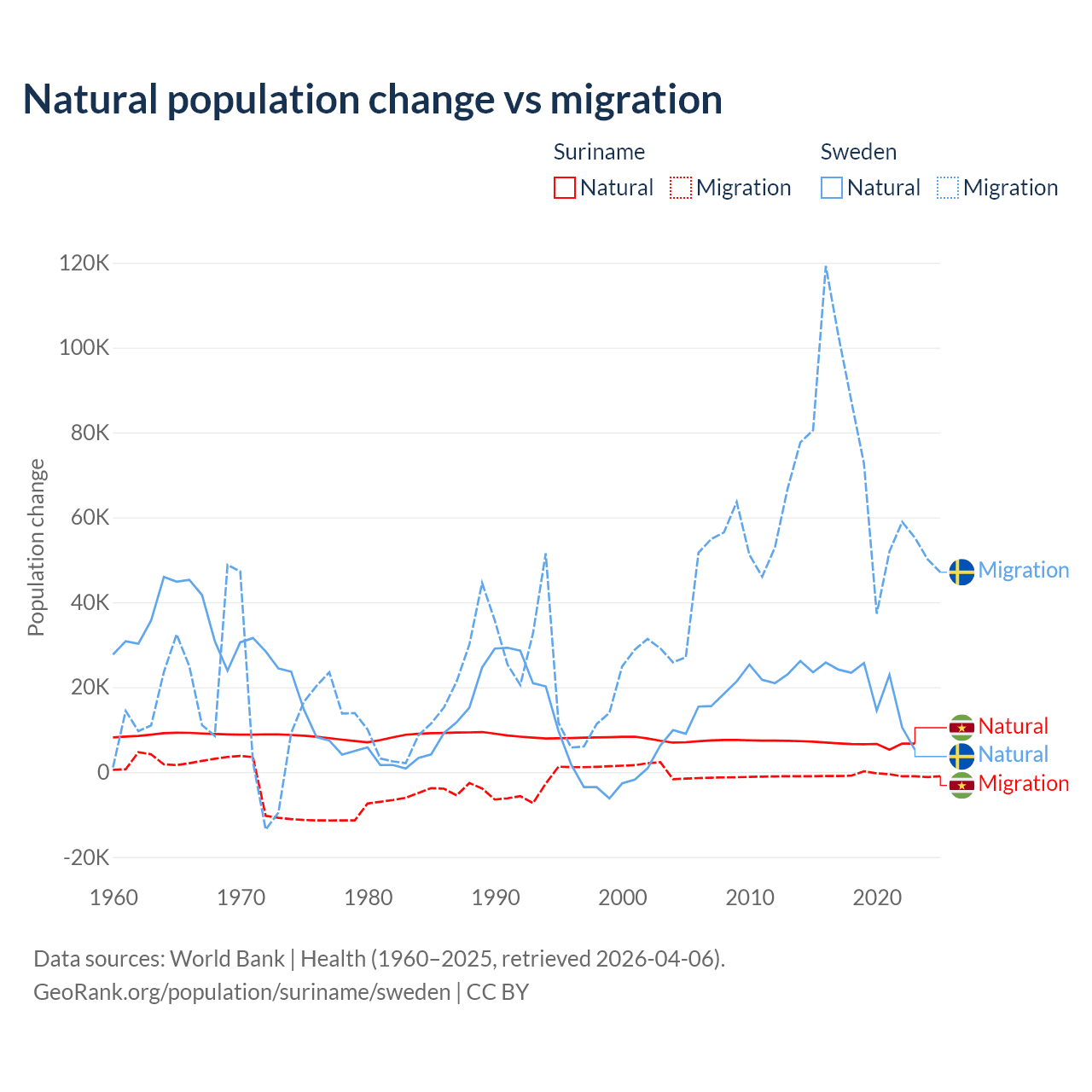 Over the last 10 years, 90.3% of the population change in Suriname is from natural causes (a gain of 66,709 people) and 9.72% is from migration (a loss of 7,185 people). In Sweden 21.4% is from natural causes (a gain of 201,900 people) and 78.6% is from migration (a gain of 743,642 people).