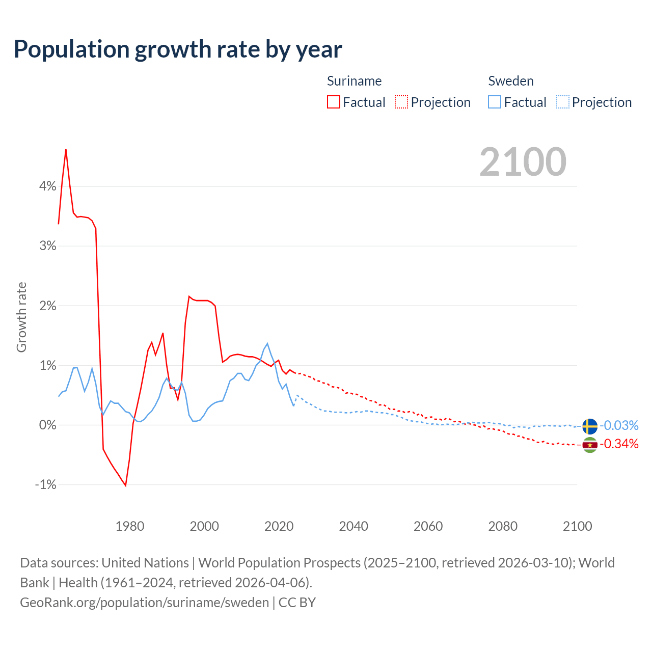 - For the last 10 years, Suriname has had an average growth rate of +0.99% per year vs +0.88% in Sweden.