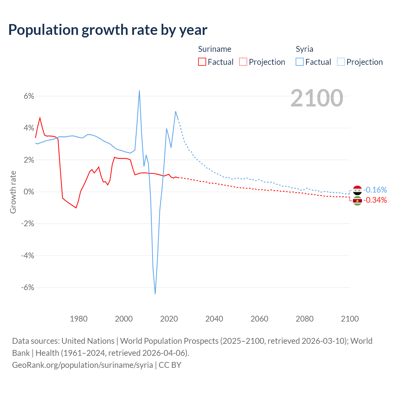 - For the last 10 years, Suriname has had an average growth rate of +0.99% per year vs +1.25% in Syria.