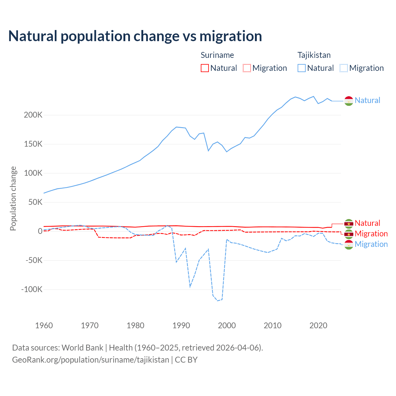 Over the last 10 years, 90.3% of the population change in Suriname is from natural causes (a gain of 66,709 people) and 9.72% is from migration (a loss of 7,185 people). In Tajikistan 96% is from natural causes (a gain of 2,266,045 people) and 3.95% is from migration (a loss of 93,205 people).