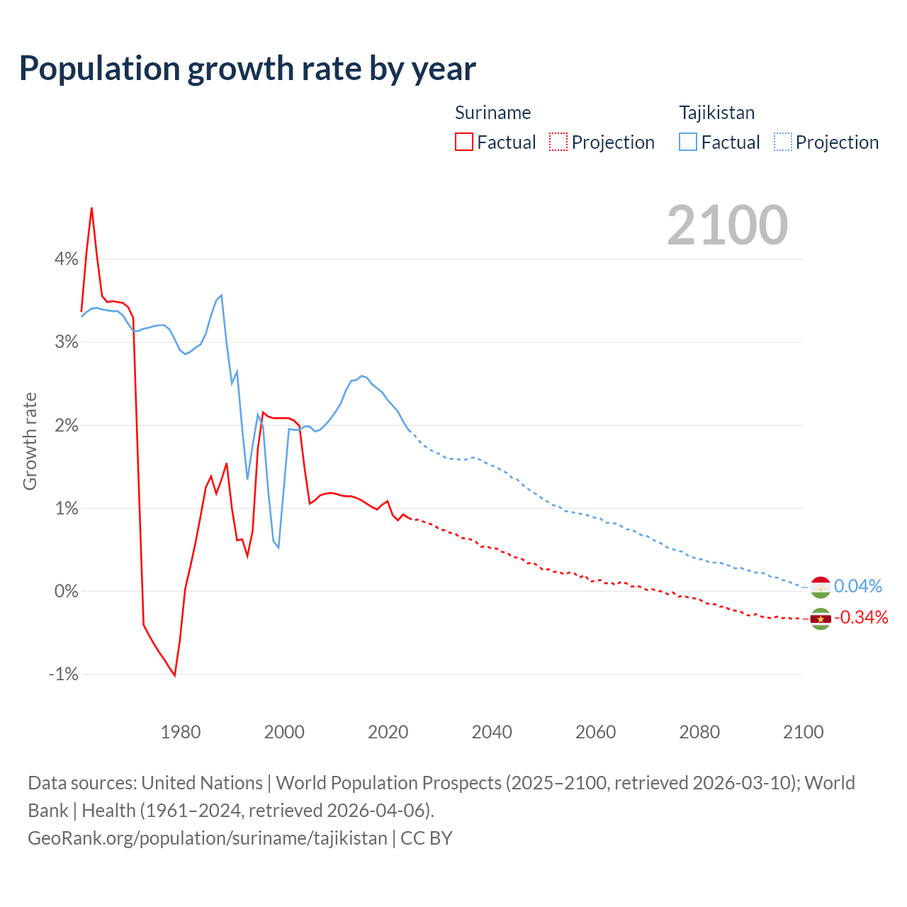 Suriname vs Tajikistan: population by year and forecast