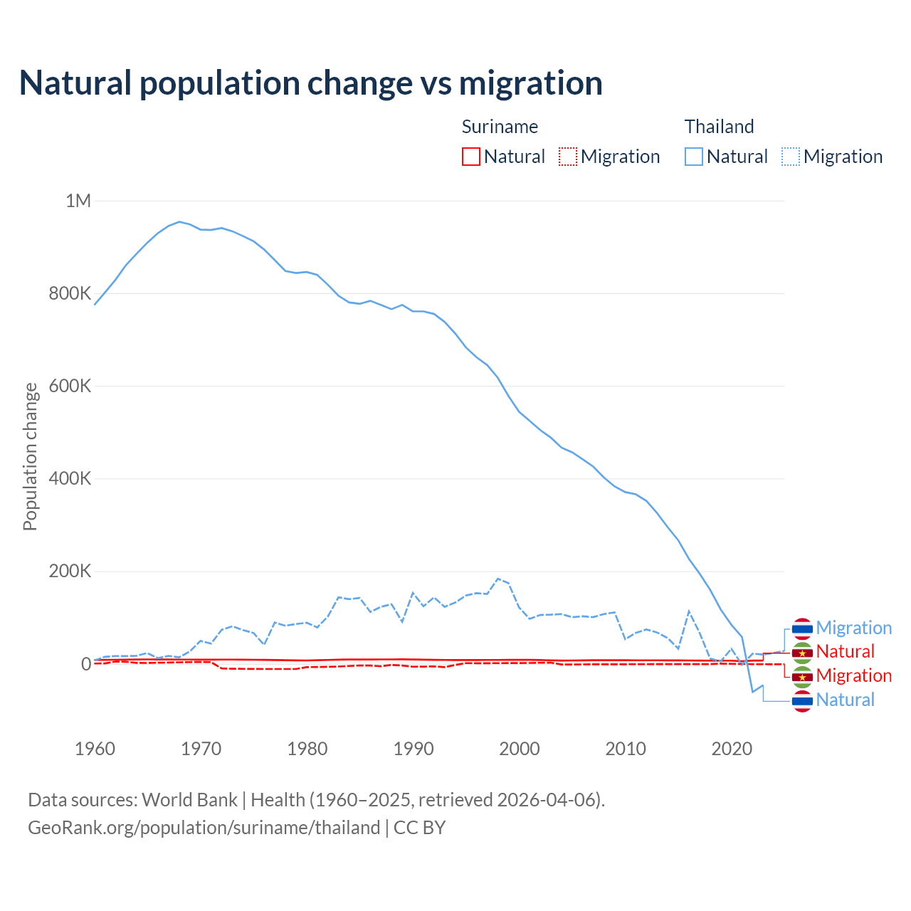 Over the last 10 years, 90.3% of the population change in Suriname is from natural causes (a gain of 66,709 people) and 9.72% is from migration (a loss of 7,185 people). In Thailand 78.4% is from natural causes (a gain of 1,292,528 people) and 21.6% is from migration (a gain of 355,361 people).