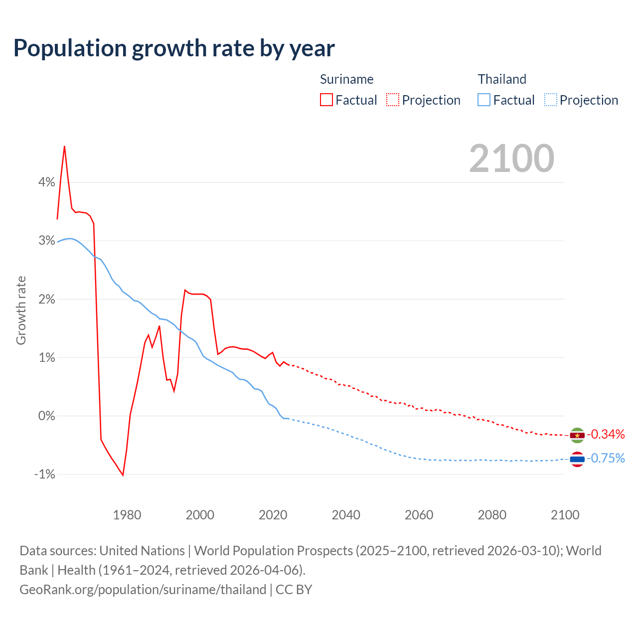 - For the last 10 years, Suriname has had an average growth rate of +0.99% per year vs +0.23% in Thailand.