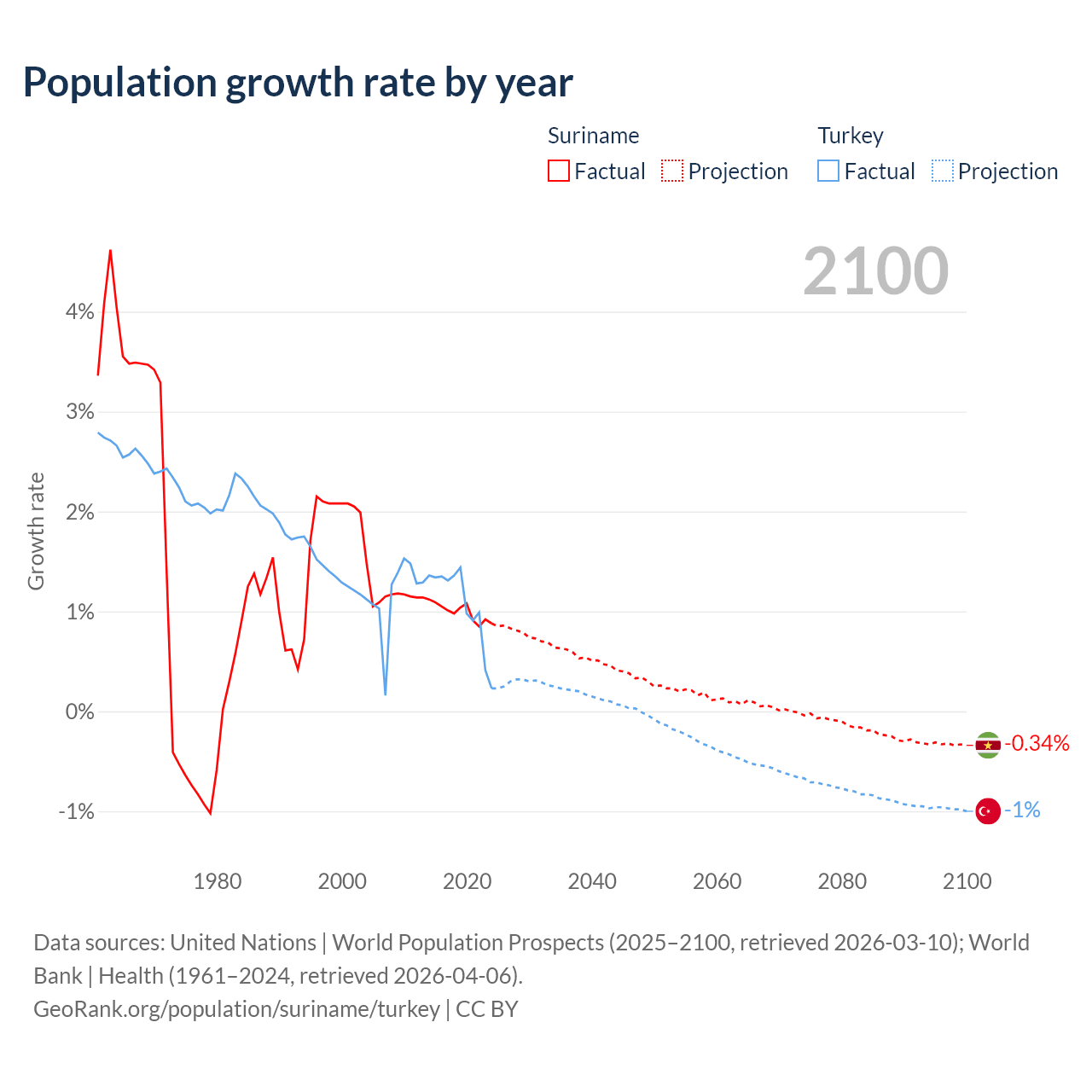 - For the last 10 years, Suriname has had an average growth rate of +0.99% per year vs +1.06% in Turkey.