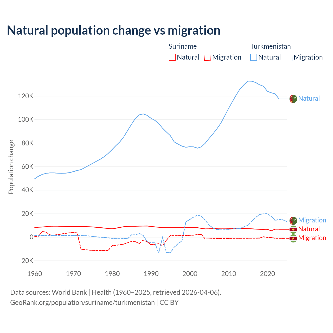 Over the last 10 years, 90.3% of the population change in Suriname is from natural causes (a gain of 66,709 people) and 9.72% is from migration (a loss of 7,185 people). In Turkmenistan 89.2% is from natural causes (a gain of 1,270,228 people) and 10.8% is from migration (a gain of 154,379 people).