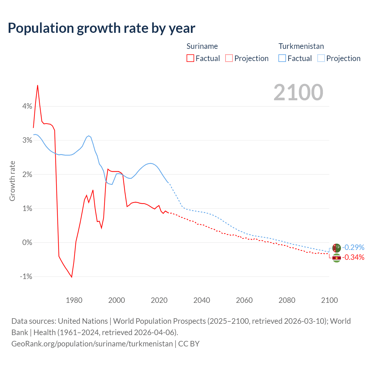 - For the last 10 years, Suriname has had an average growth rate of +0.99% per year vs +2.14% in Turkmenistan.