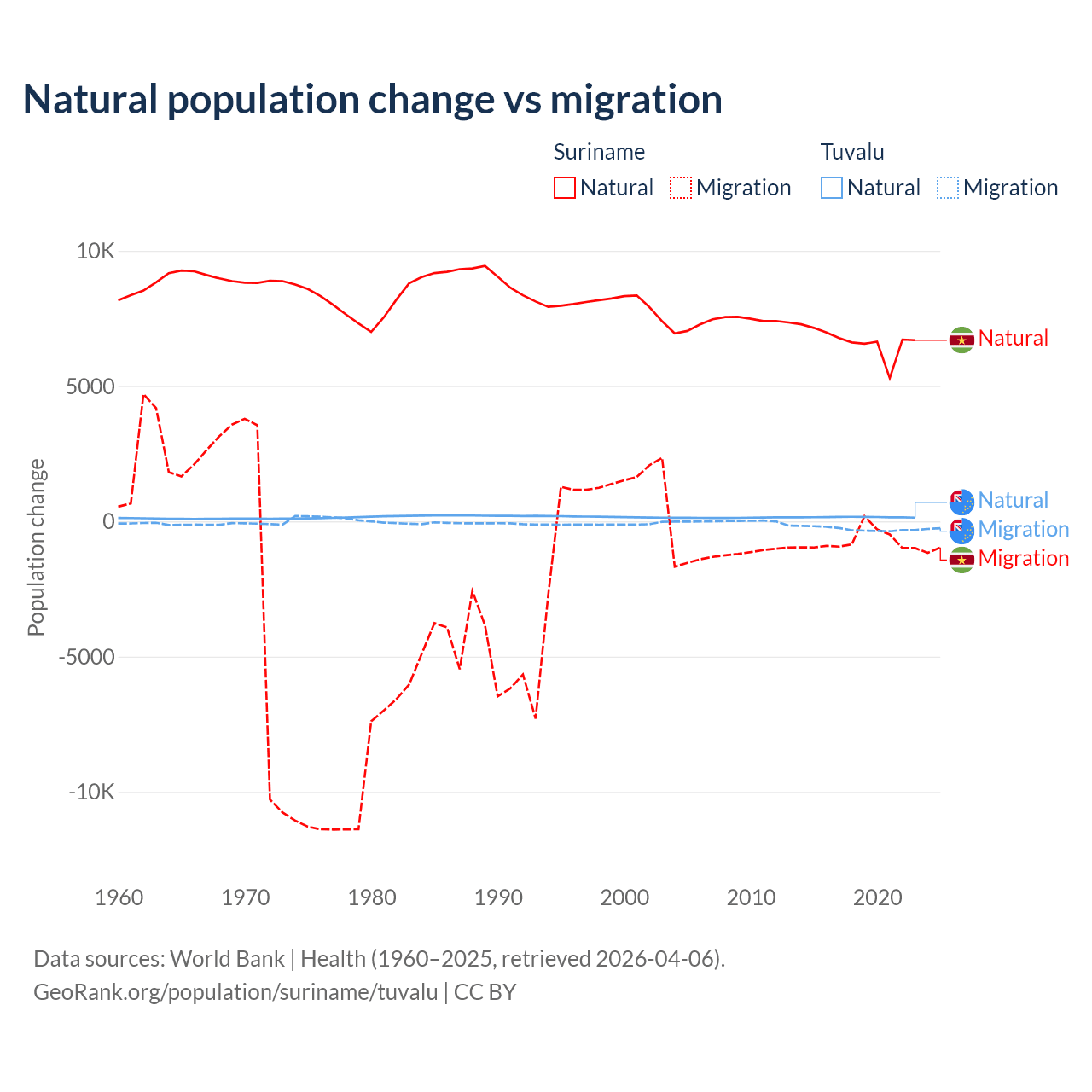 Over the last 10 years, 90.3% of the population change in Suriname is from natural causes (a gain of 66,709 people) and 9.72% is from migration (a loss of 7,185 people). In Tuvalu 35.5% is from natural causes (a gain of 1,556 people) and 64.5% is from migration (a loss of 2,827 people).