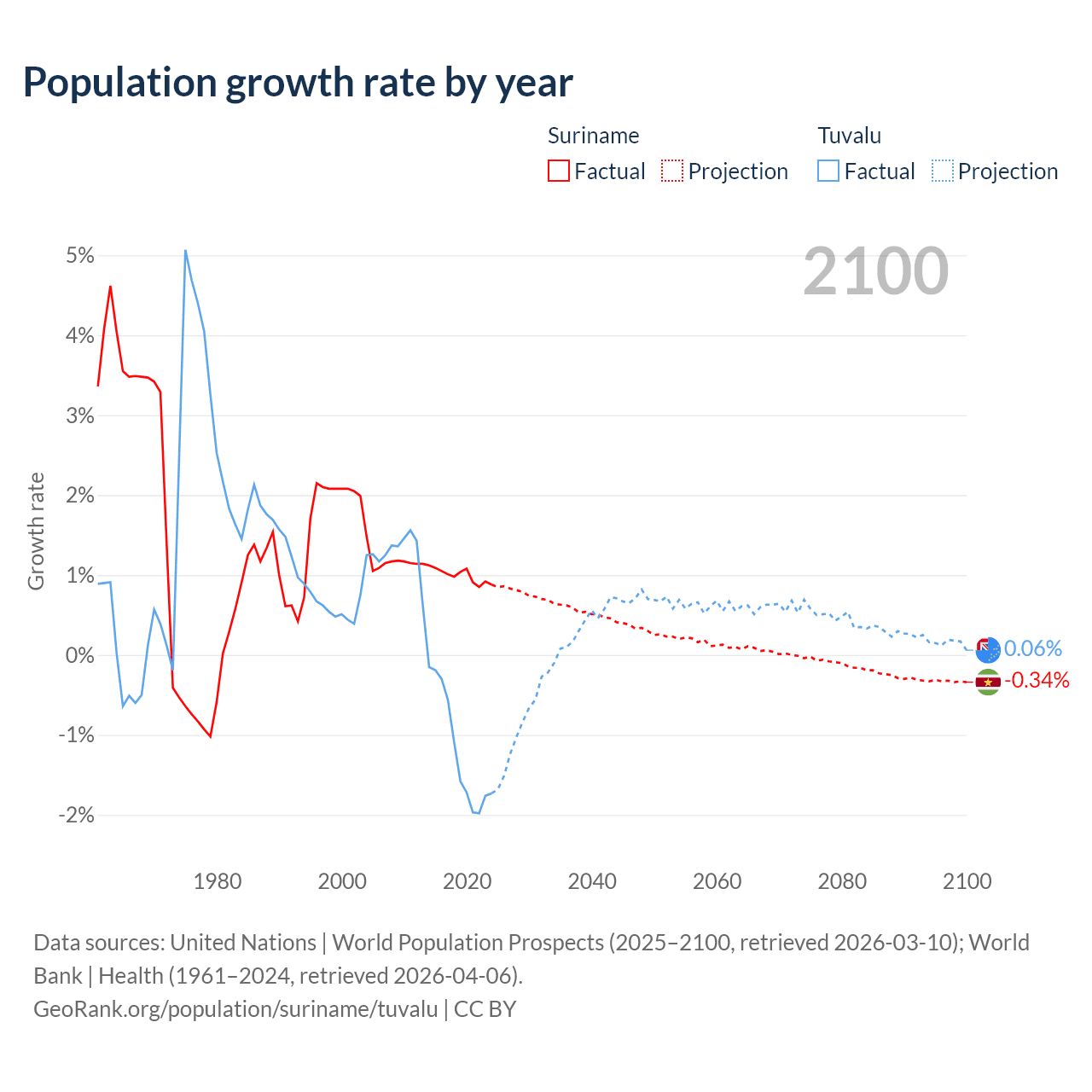 - For the last 10 years, Suriname has had an average growth rate of +0.99% per year vs -1.19% in Tuvalu.