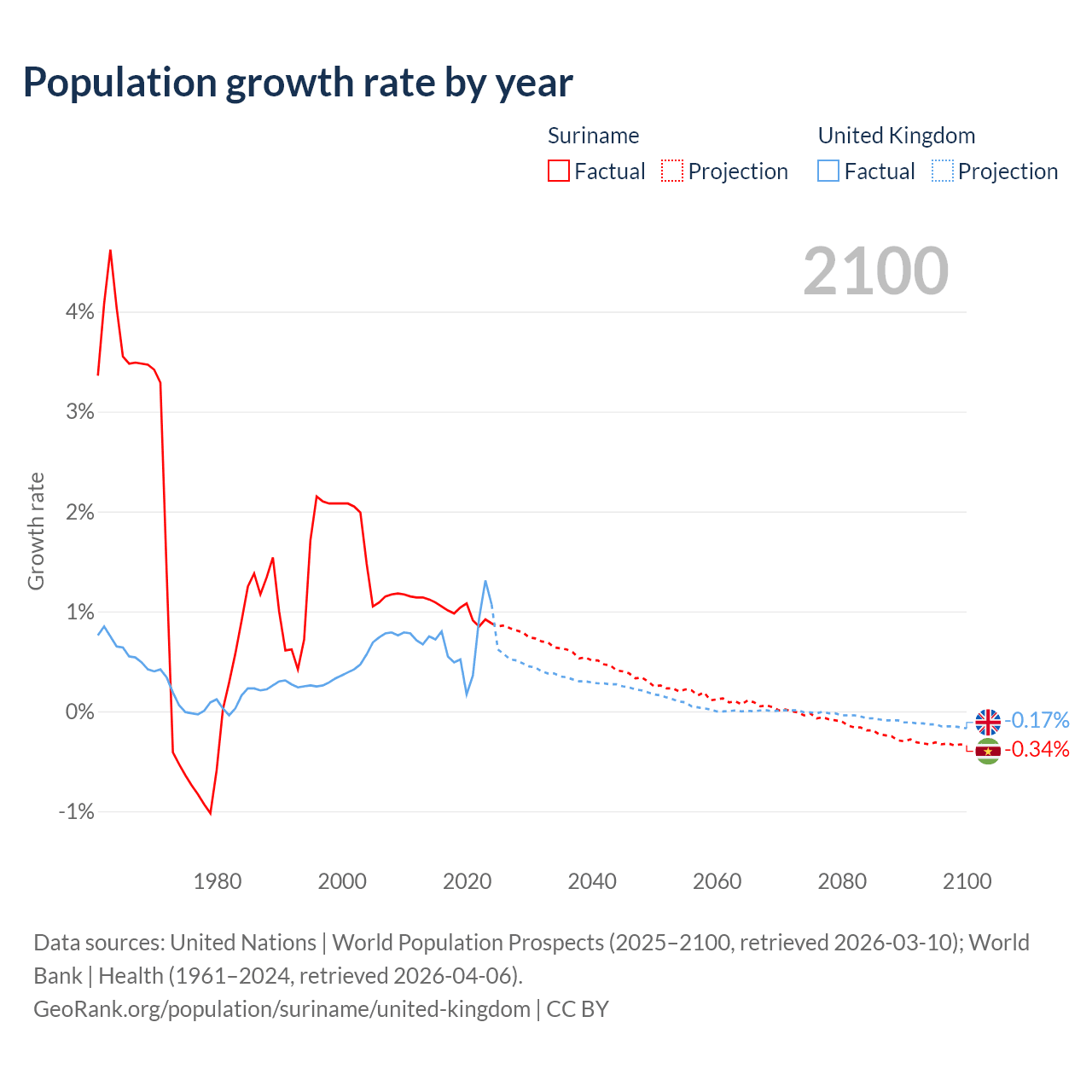 - For the last 10 years, Suriname has had an average growth rate of +0.99% per year vs +0.7% in the United Kingdom.