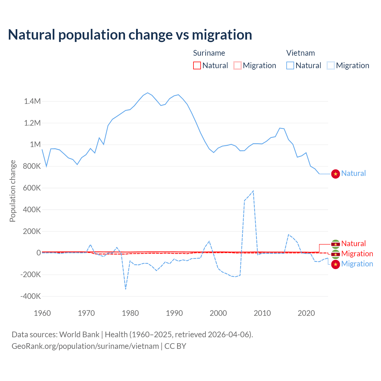 Over the last 10 years, 90.3% of the population change in Suriname is from natural causes (a gain of 66,709 people) and 9.72% is from migration (a loss of 7,185 people). In Vietnam 97.7% is from natural causes (a gain of 9,349,756 people) and 2.29% is from migration (a gain of 219,073 people).