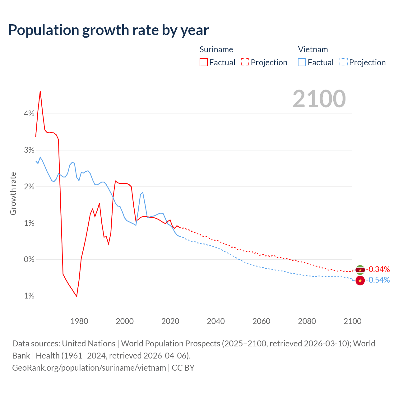 - For the last 10 years, Suriname has had an average growth rate of +0.99% per year vs +0.99% in Vietnam.