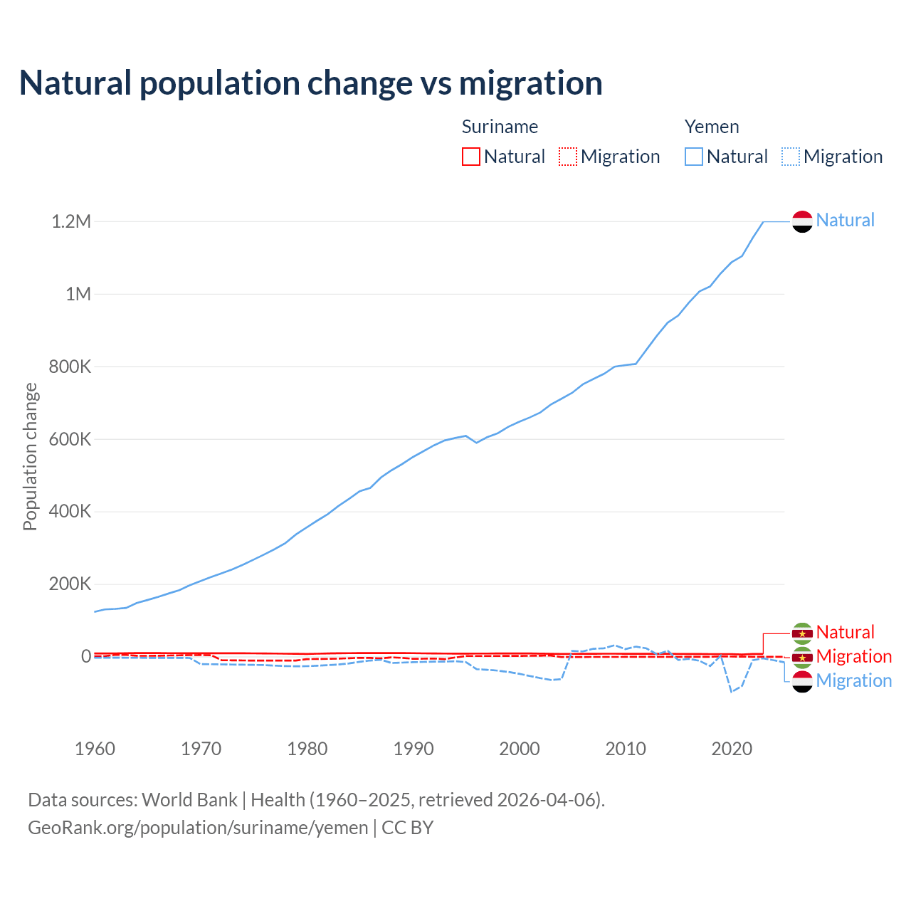 Over the last 10 years, 90.3% of the population change in Suriname is from natural causes (a gain of 66,709 people) and 9.72% is from migration (a loss of 7,185 people). In Yemen 97.8% is from natural causes (a gain of 10,460,813 people) and 2.17% is from migration (a loss of 231,814 people).