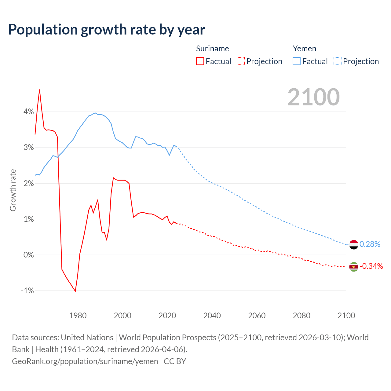 - For the last 10 years, Suriname has had an average growth rate of +0.99% per year vs +3% in Yemen.