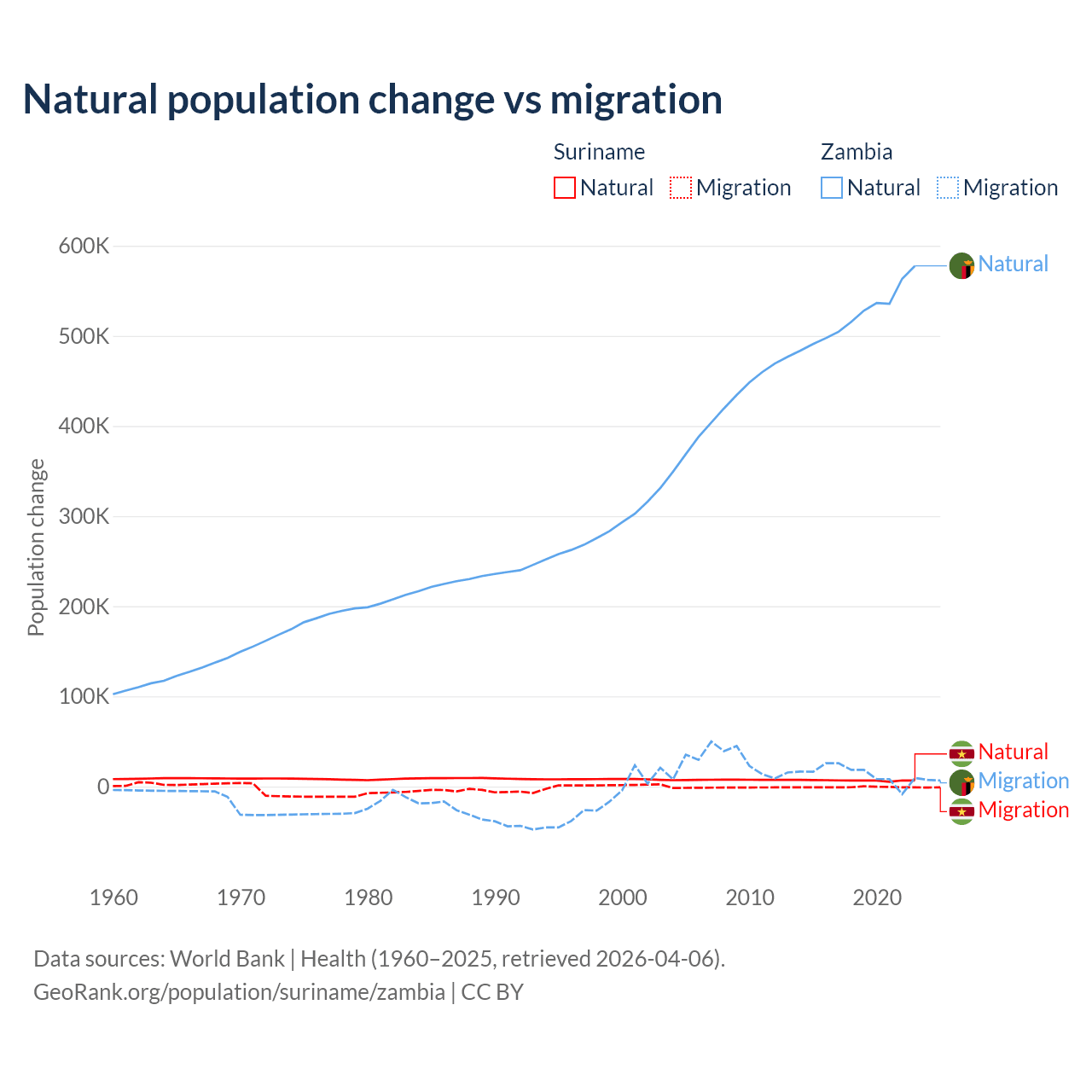 Over the last 10 years, 90.3% of the population change in Suriname is from natural causes (a gain of 66,709 people) and 9.72% is from migration (a loss of 7,185 people). In Zambia 97.4% is from natural causes (a gain of 5,233,797 people) and 2.58% is from migration (a gain of 138,554 people).