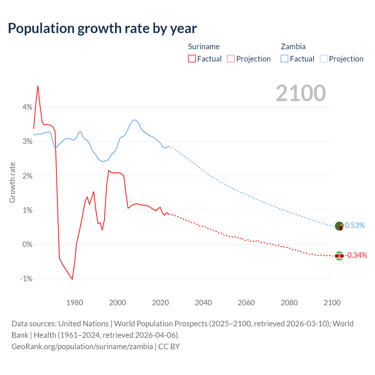 - For the last 10 years, Suriname has had an average growth rate of +0.99% per year vs +3% in Zambia.