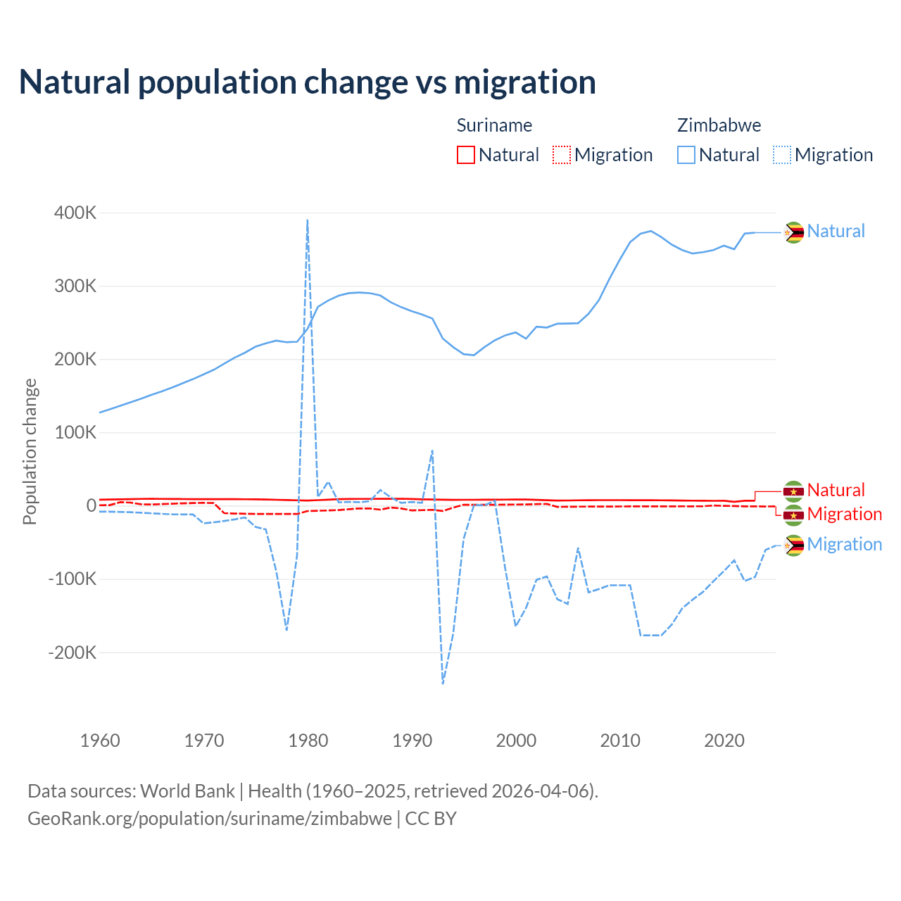 Over the last 10 years, 90.3% of the population change in Suriname is from natural causes (a gain of 66,709 people) and 9.72% is from migration (a loss of 7,185 people). In Zimbabwe 74.9% is from natural causes (a gain of 3,558,487 people) and 25.1% is from migration (a loss of 1,192,807 people).