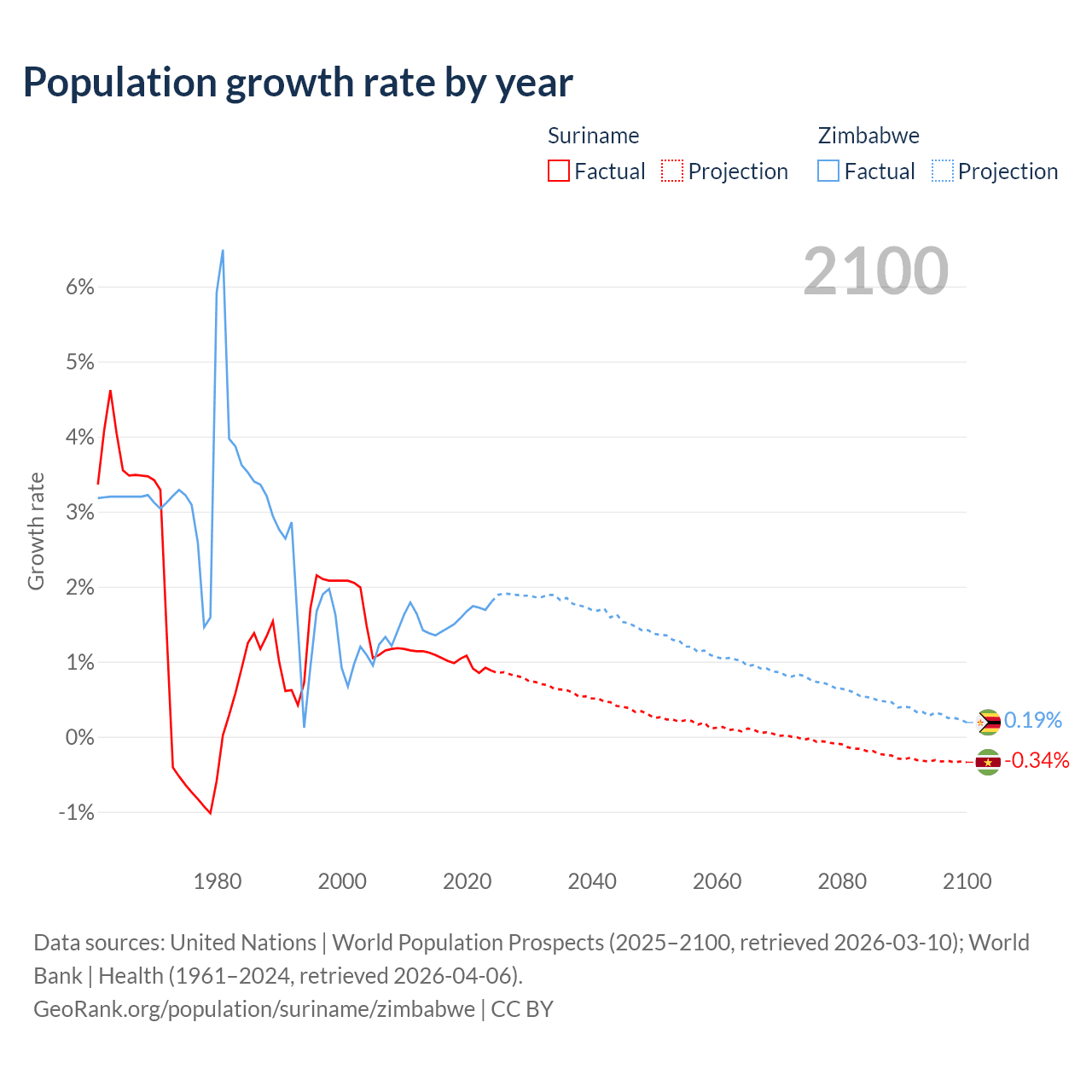 - For the last 10 years, Suriname has had an average growth rate of +0.99% per year vs +1.57% in Zimbabwe.