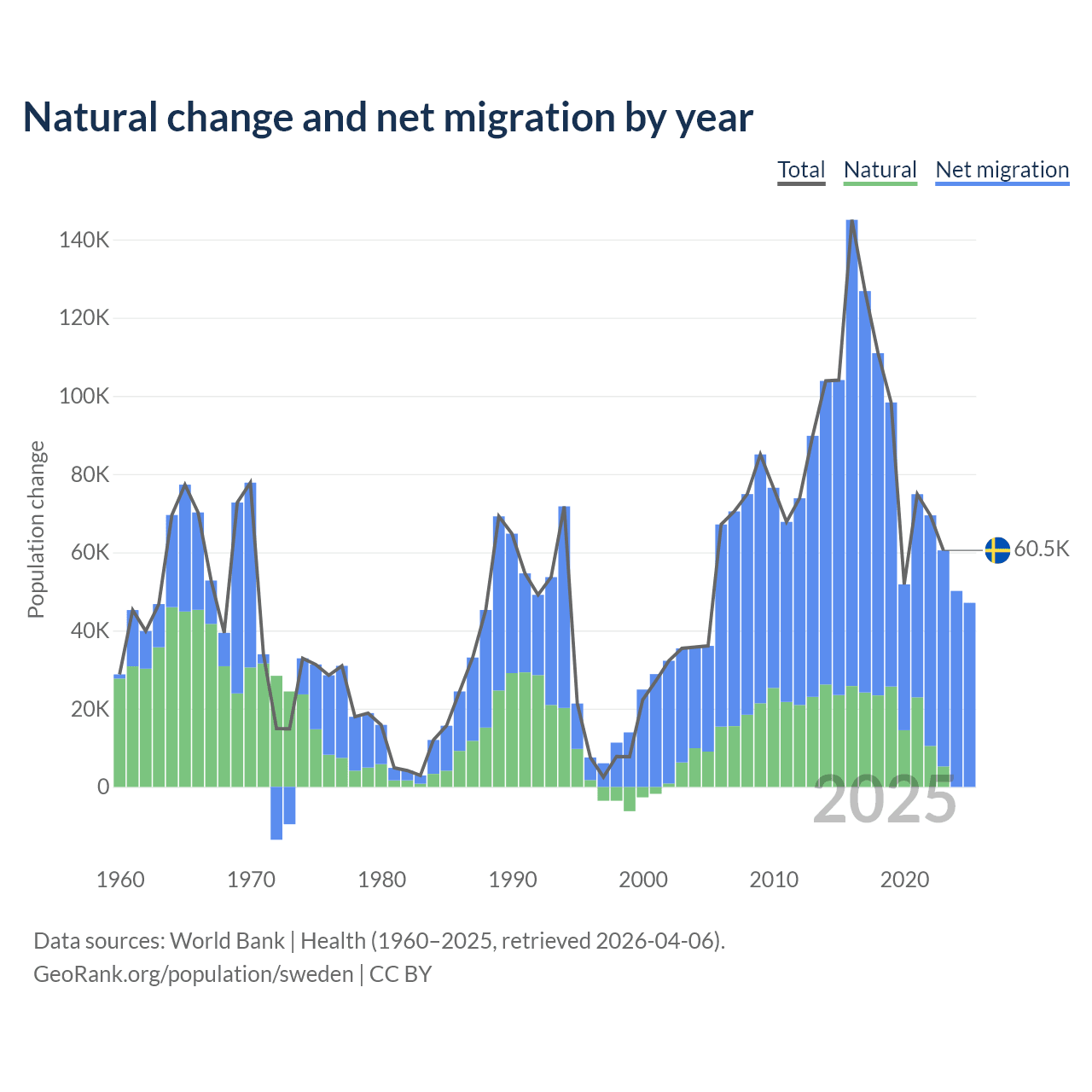 Over the last 10 years, 21.4% of the population change in Sweden is from natural causes (a gain of 201,900 people) and 78.6% is from migration (a gain of 743,642 people).