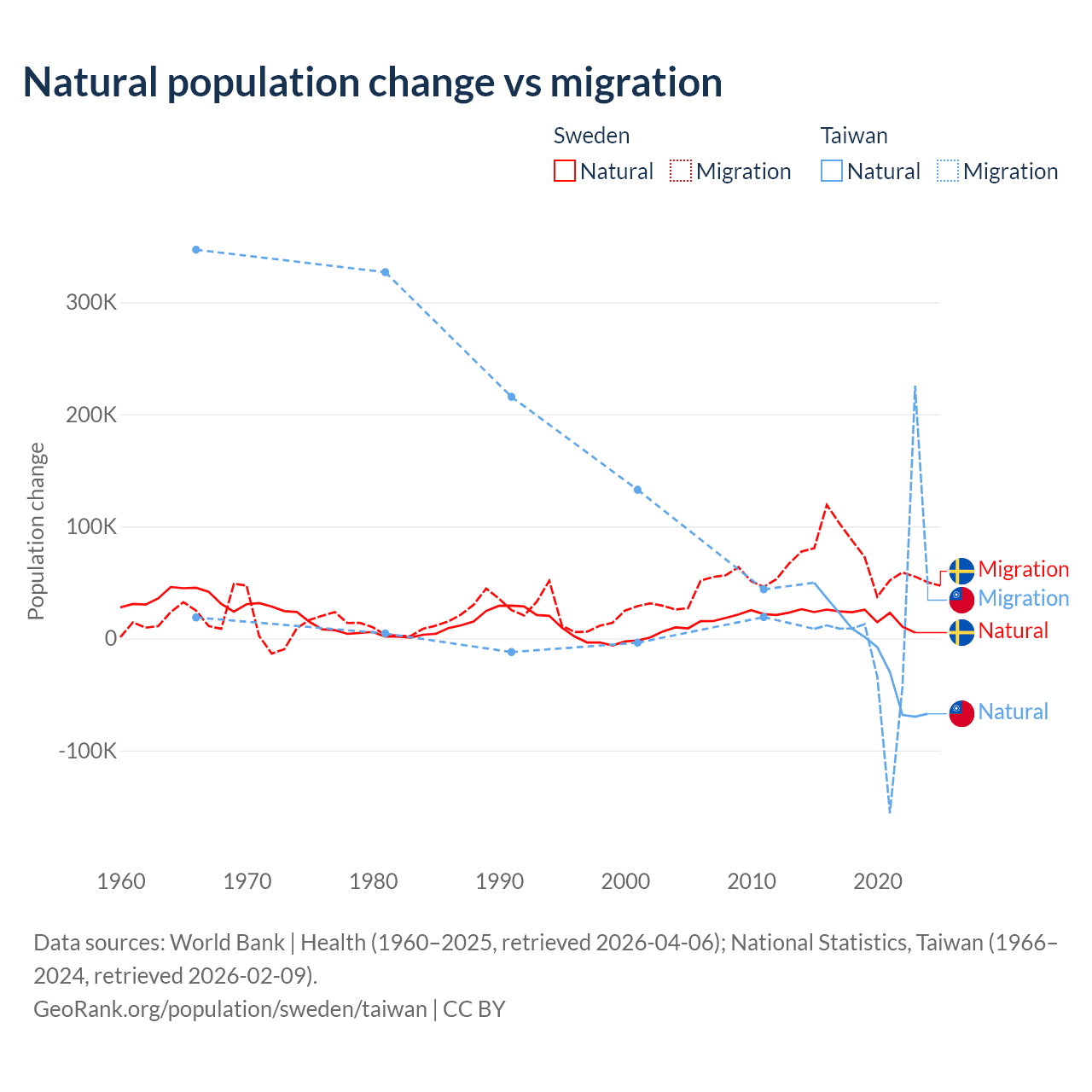 Over the last 10 years, 21.4% of the population change in Sweden is from natural causes (a gain of 201,900 people) and 78.6% is from migration (a gain of 743,642 people). In Taiwan 56.7% is from natural causes (a loss of 57,467 people) and 43.3% is from migration (a gain of 43,884 people).