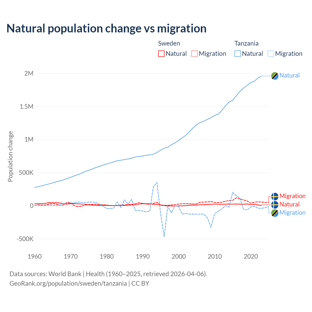 Over the last 10 years, 21.4% of the population change in Sweden is from natural causes (a gain of 201,900 people) and 78.6% is from migration (a gain of 743,642 people). In Tanzania 98.7% is from natural causes (a gain of 17,769,541 people) and 1.27% is from migration (a gain of 229,466 people).