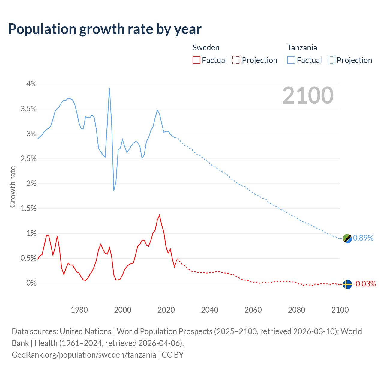- For the last 10 years, Sweden has had an average growth rate of +0.88% per year vs +3.13% in Tanzania.