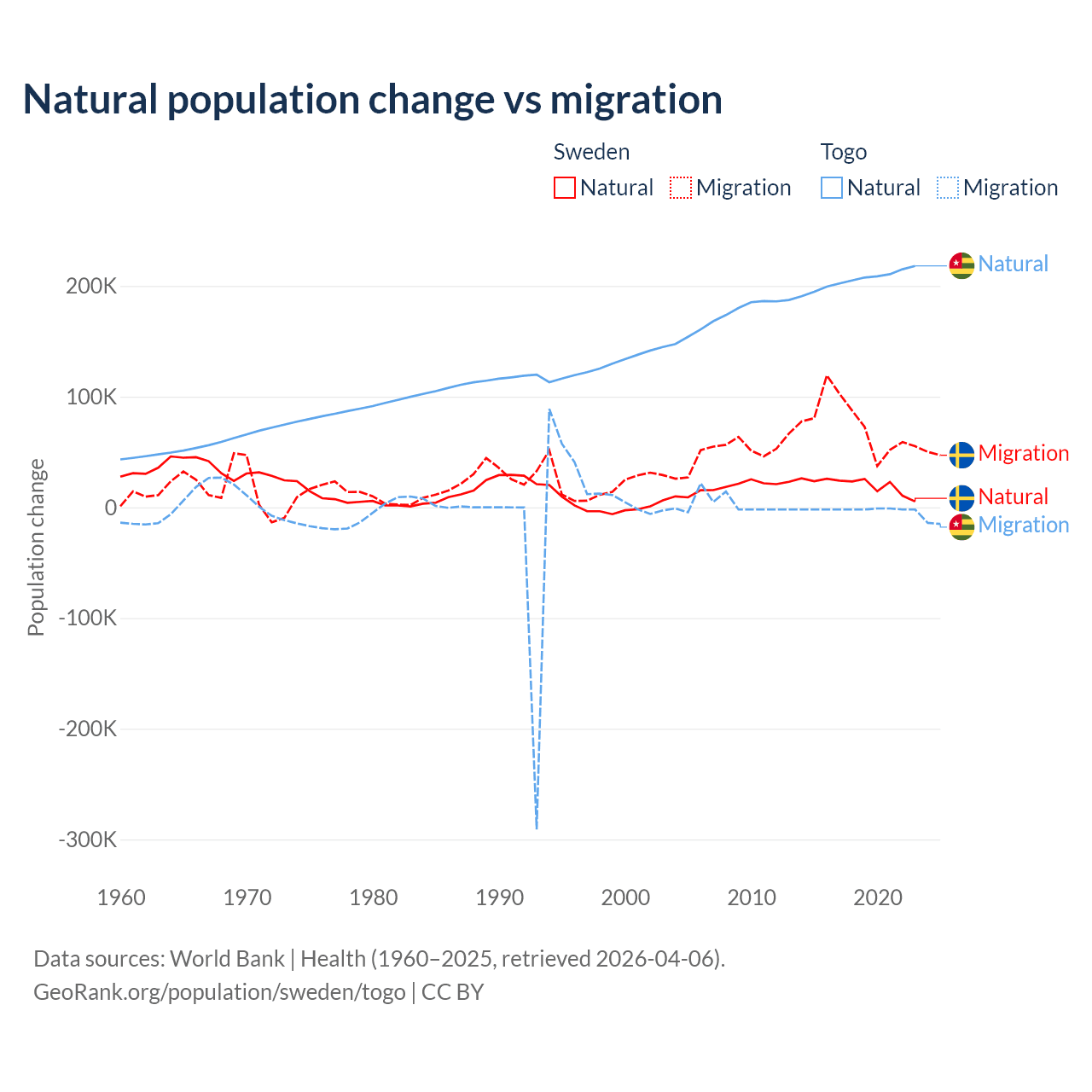 Over the last 10 years, 21.4% of the population change in Sweden is from natural causes (a gain of 201,900 people) and 78.6% is from migration (a gain of 743,642 people). In Togo 99.1% is from natural causes (a gain of 2,052,115 people) and 0.86% is from migration (a loss of 17,852 people).