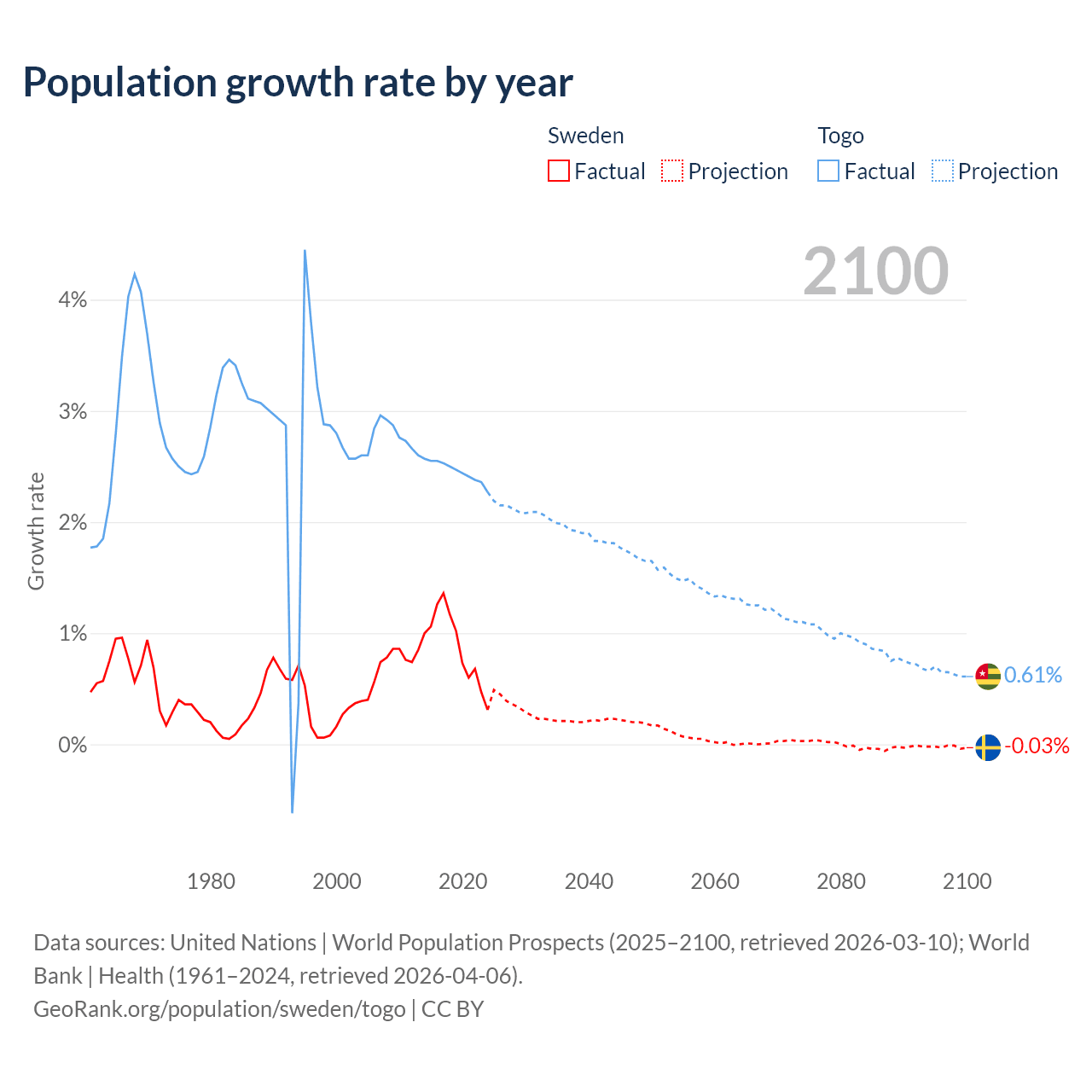 - For the last 10 years, Sweden has had an average growth rate of +0.88% per year vs +2.46% in Togo.