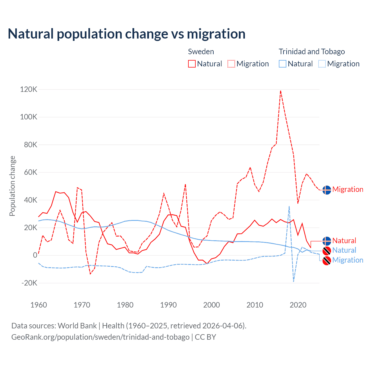 Over the last 10 years, 21.4% of the population change in Sweden is from natural causes (a gain of 201,900 people) and 78.6% is from migration (a gain of 743,642 people). In Trinidad and Tobago 66% is from natural causes (a gain of 55,887 people) and 34% is from migration (a gain of 28,785 people).
