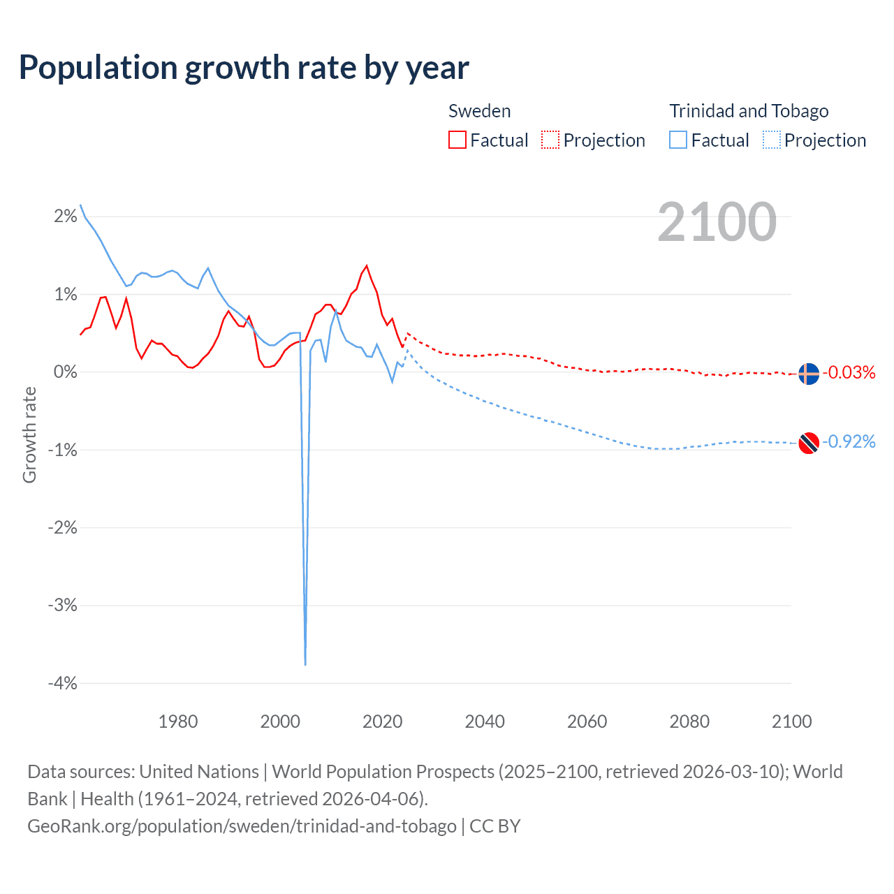 - For the last 10 years, Sweden has had an average growth rate of +0.88% per year vs +0.19% in Trinidad and Tobago.