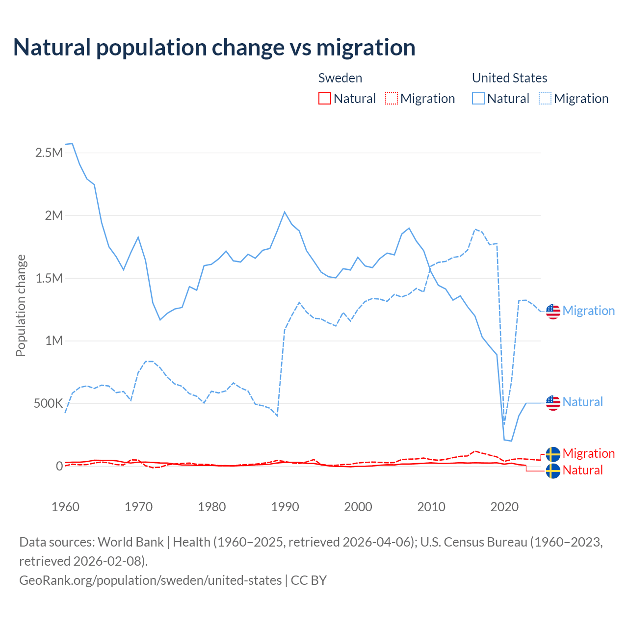 Over the last 10 years, 21.4% of the population change in Sweden is from natural causes (a gain of 201,900 people) and 78.6% is from migration (a gain of 743,642 people). In the United States 35.8% is from natural causes (a gain of 8,005,866 people) and 64.2% is from migration (a gain of 14,334,286 people).