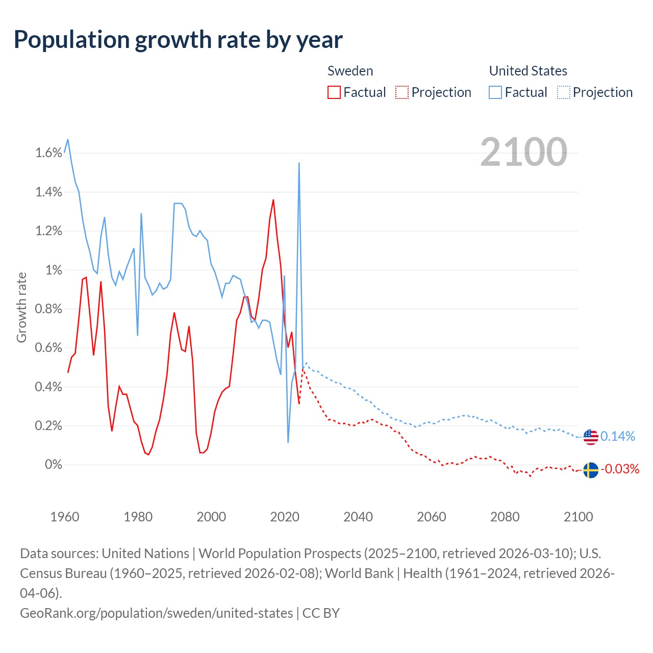 - For the last 10 years, Sweden has had an average growth rate of +0.88% per year vs +0.65% in the United States.