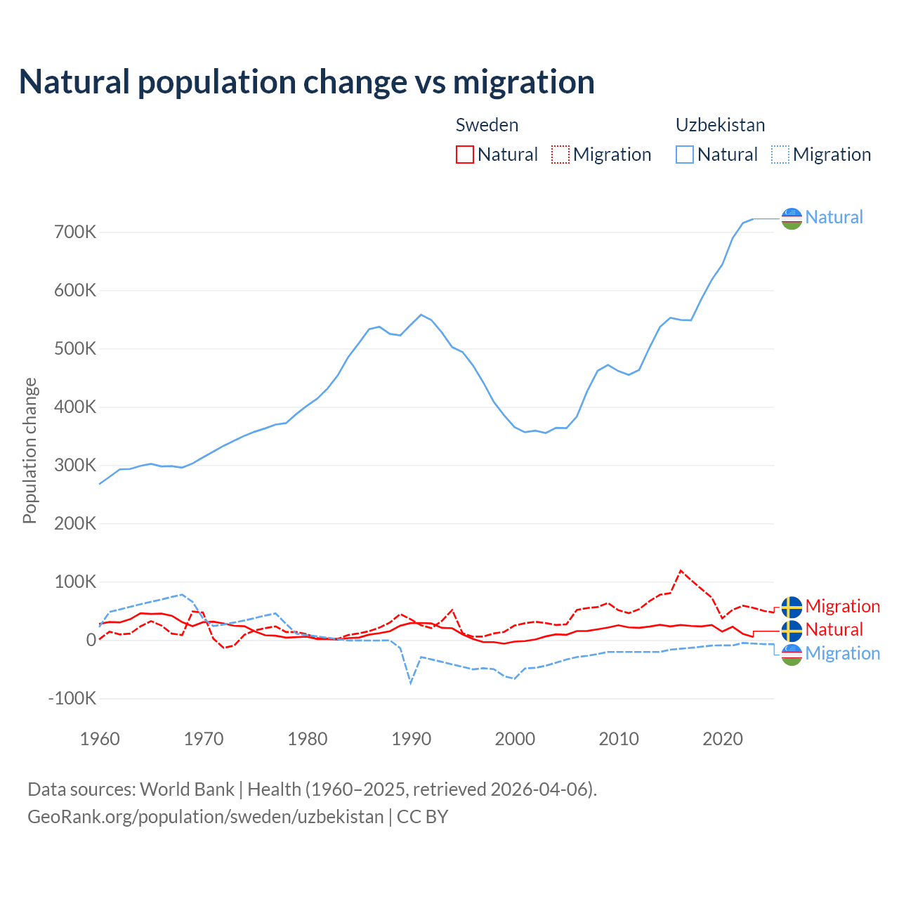 Over the last 10 years, 21.4% of the population change in Sweden is from natural causes (a gain of 201,900 people) and 78.6% is from migration (a gain of 743,642 people). In Uzbekistan 98.2% is from natural causes (a gain of 6,161,117 people) and 1.84% is from migration (a loss of 115,398 people).