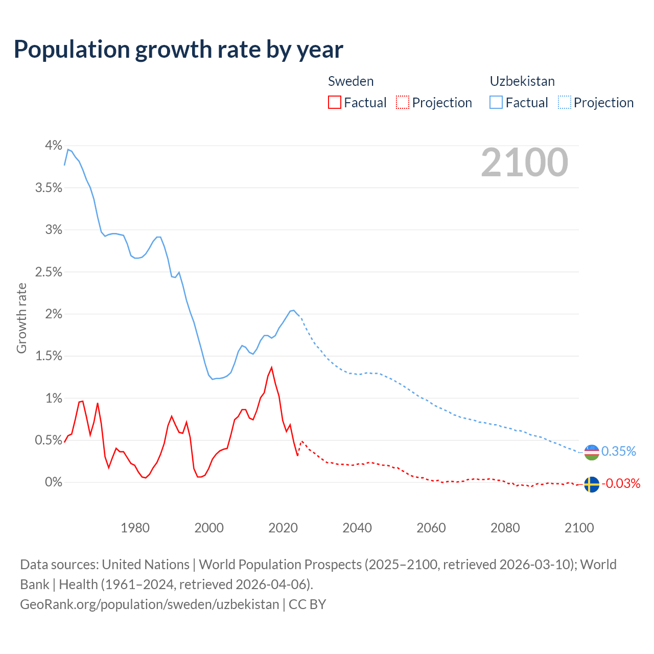 - For the last 10 years, Sweden has had an average growth rate of +0.88% per year vs +1.85% in Uzbekistan.