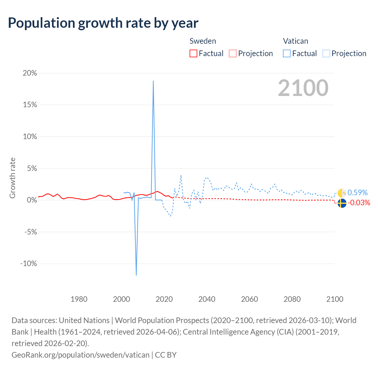 - For the last 10 years, Sweden has had an average growth rate of +0.88% per year vs +1.9% in the Vatican.