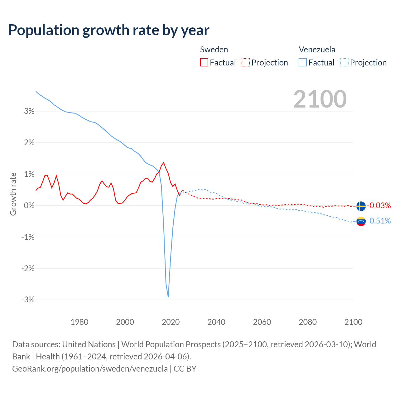 - For the last 10 years, Sweden has had an average growth rate of +0.88% per year vs -0.46% in Venezuela.