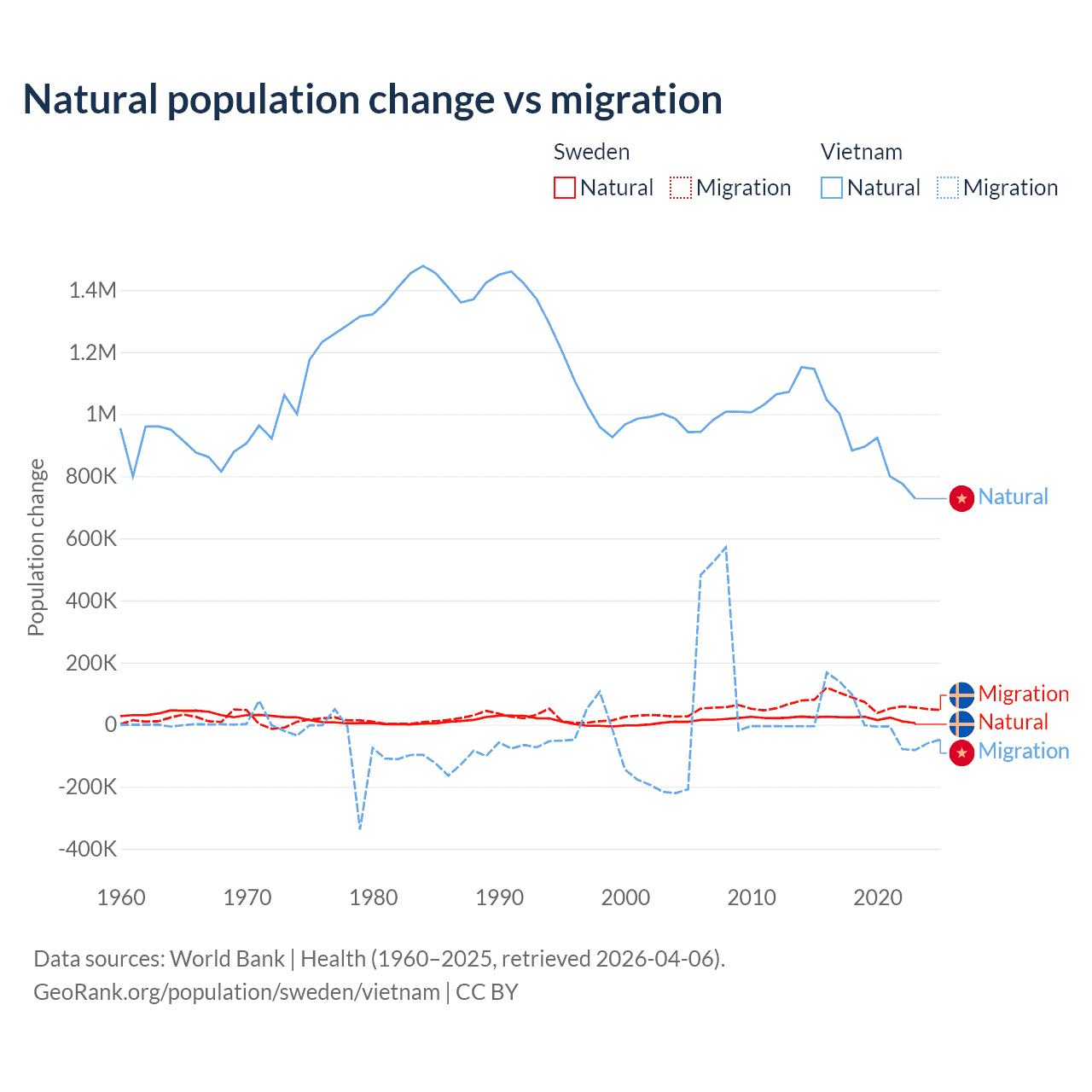 Over the last 10 years, 21.4% of the population change in Sweden is from natural causes (a gain of 201,900 people) and 78.6% is from migration (a gain of 743,642 people). In Vietnam 97.7% is from natural causes (a gain of 9,349,756 people) and 2.29% is from migration (a gain of 219,073 people).