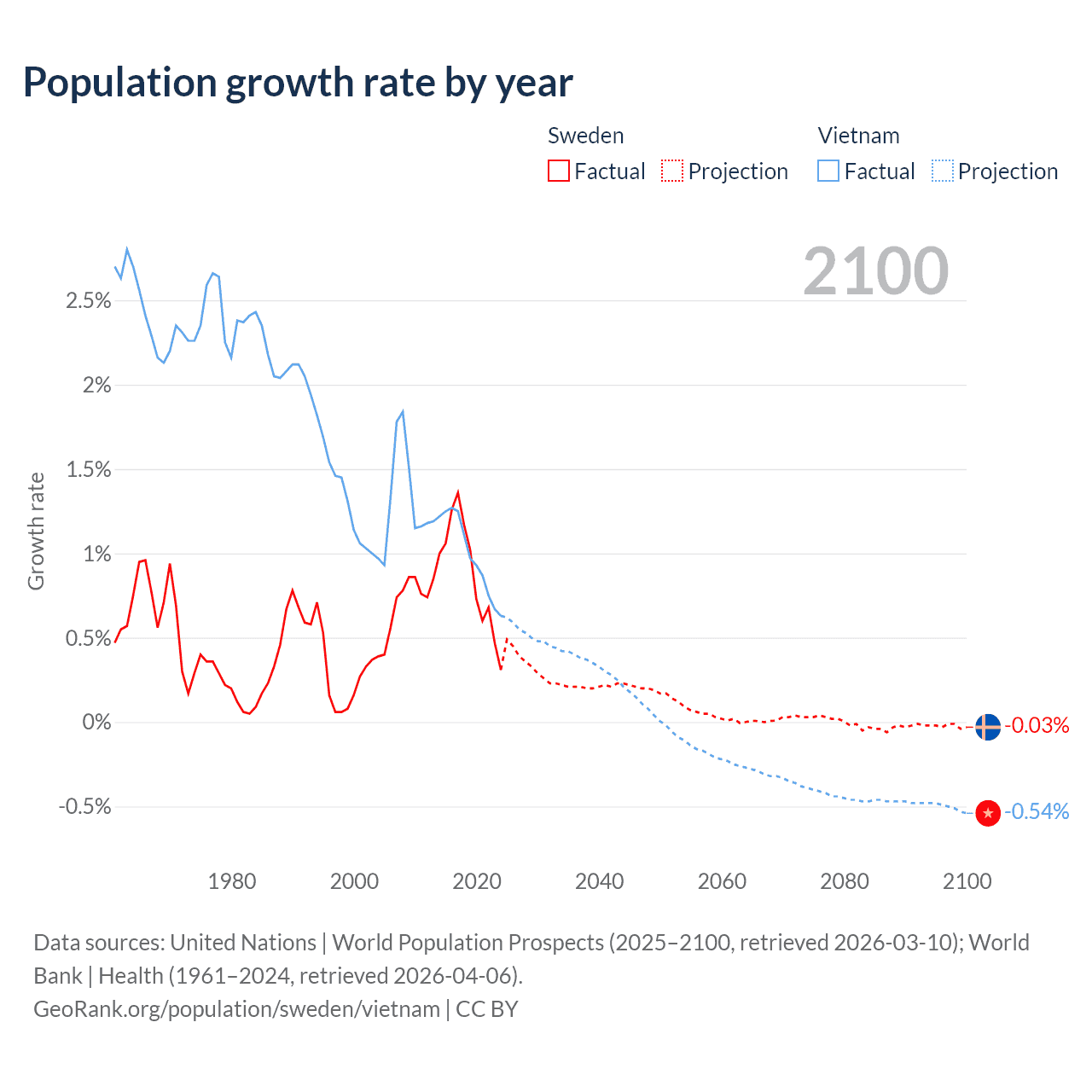 - For the last 10 years, Sweden has had an average growth rate of +0.88% per year vs +0.99% in Vietnam.