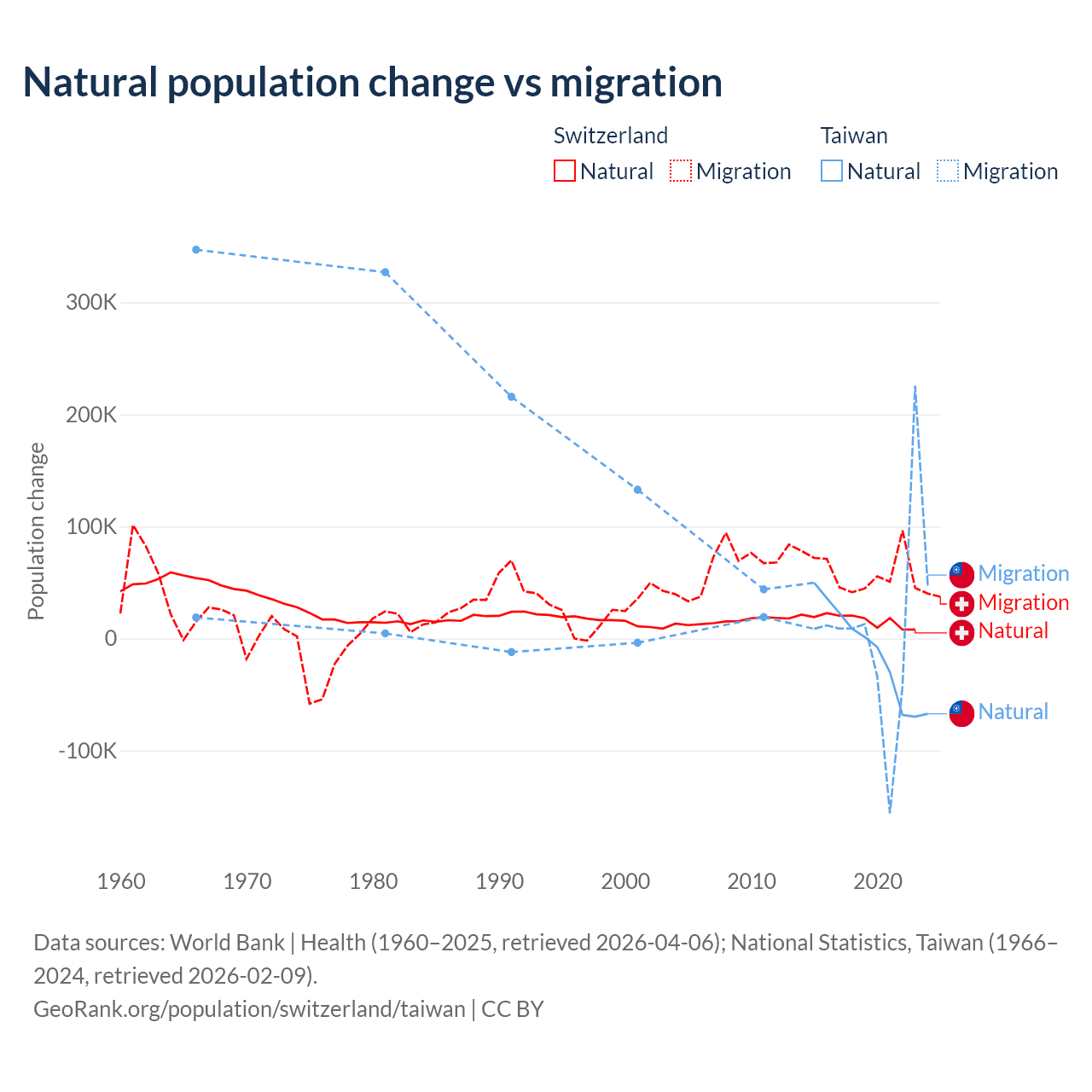 Over the last 10 years, 21.6% of the population change in Switzerland is from natural causes (a gain of 165,354 people) and 78.4% is from migration (a gain of 600,145 people). In Taiwan 56.7% is from natural causes (a loss of 57,467 people) and 43.3% is from migration (a gain of 43,884 people).