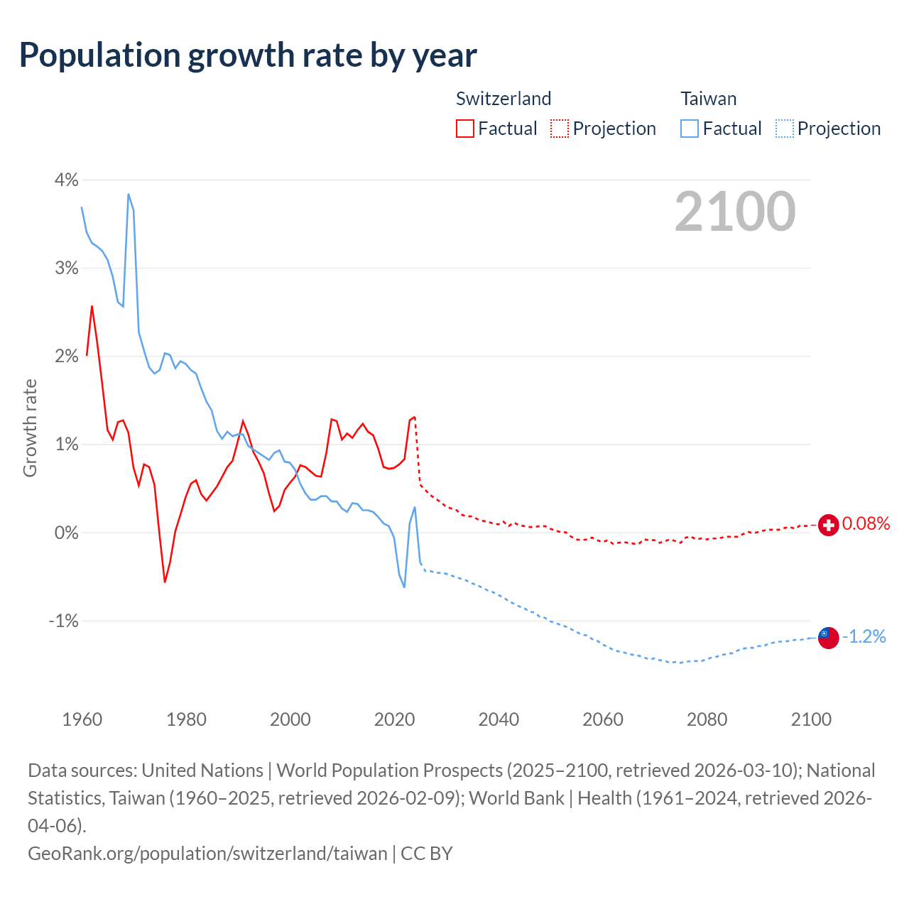 Data sources: World Bank | Health (1960–2024, retrieved 2026-04-06); United Nations | World Population Prospects (1960–2026, retrieved 2026-03-10); U.S. Census Bureau (1960–2025, retrieved 2026-02-08); National Statistics, Taiwan (1960–2025, retrieved 2026-02-09); Central Intelligence Agency (CIA) (2000–2019, retrieved 2026-02-20).