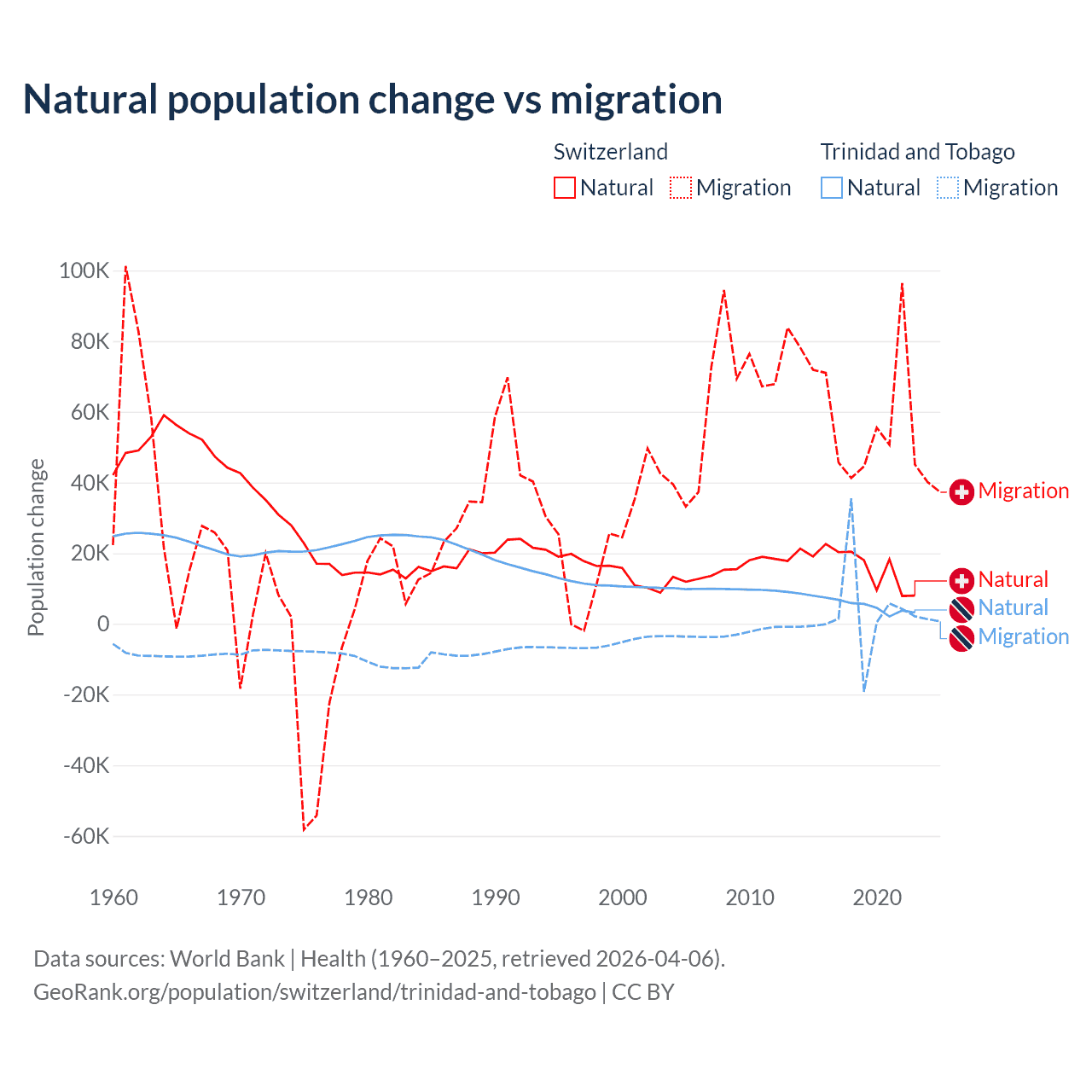 Over the last 10 years, 21.6% of the population change in Switzerland is from natural causes (a gain of 165,354 people) and 78.4% is from migration (a gain of 600,145 people). In Trinidad and Tobago 66% is from natural causes (a gain of 55,887 people) and 34% is from migration (a gain of 28,785 people).