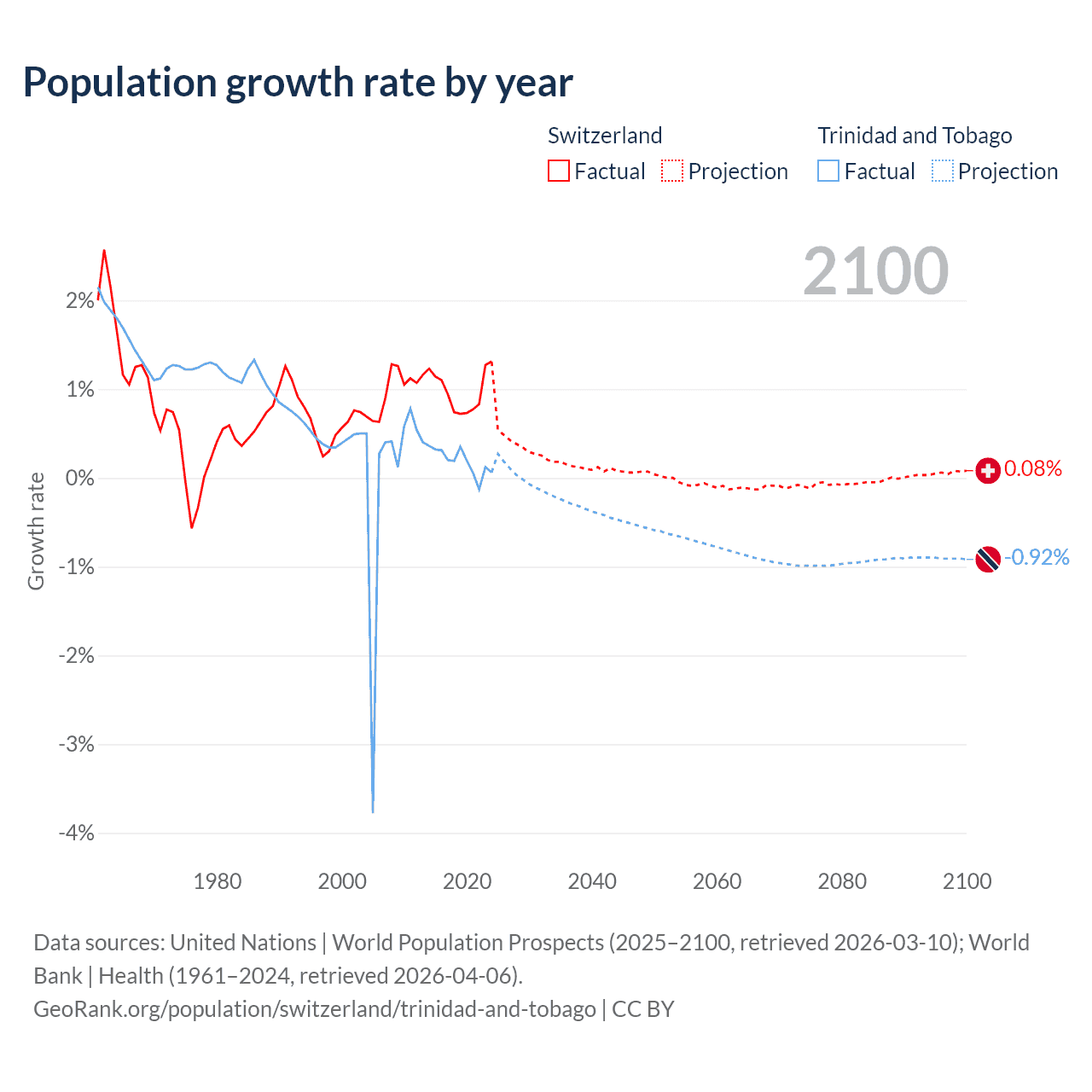 - For the last 10 years, Switzerland has had an average growth rate of +0.98% per year vs +0.19% in Trinidad and Tobago.
