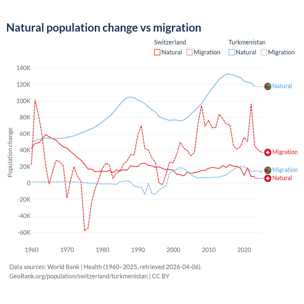 Over the last 10 years, 21.6% of the population change in Switzerland is from natural causes (a gain of 165,354 people) and 78.4% is from migration (a gain of 600,145 people). In Turkmenistan 89.2% is from natural causes (a gain of 1,270,228 people) and 10.8% is from migration (a gain of 154,379 people).