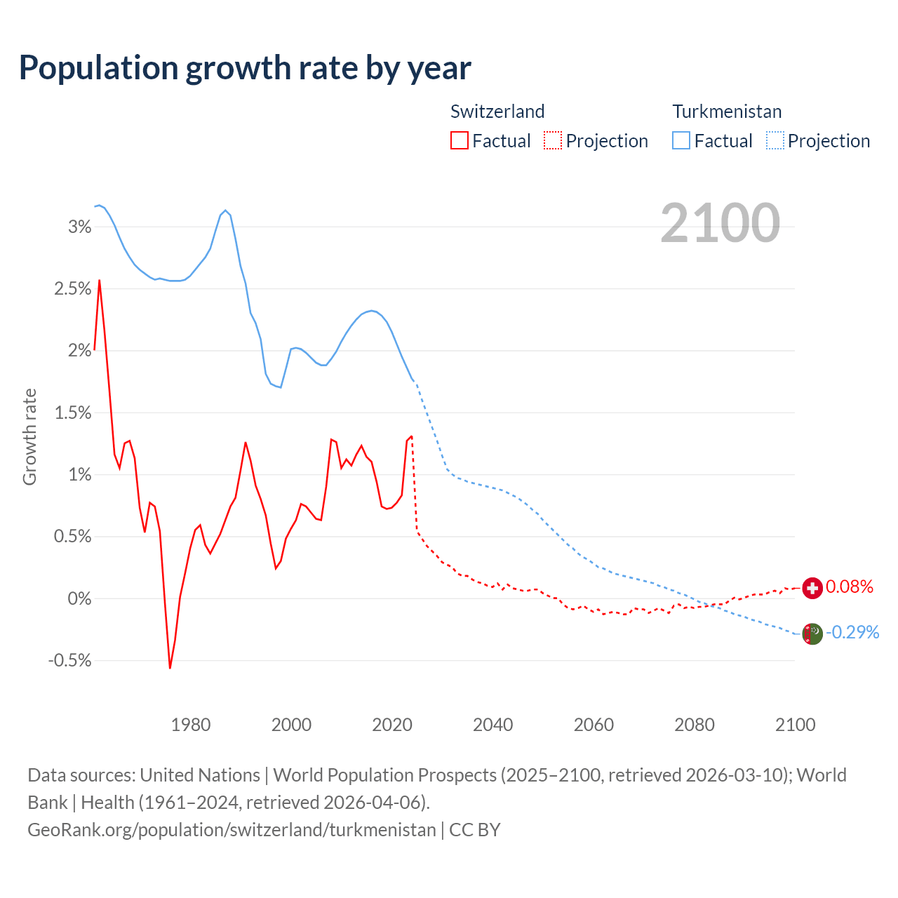 - For the last 10 years, Switzerland has had an average growth rate of +0.98% per year vs +2.14% in Turkmenistan.