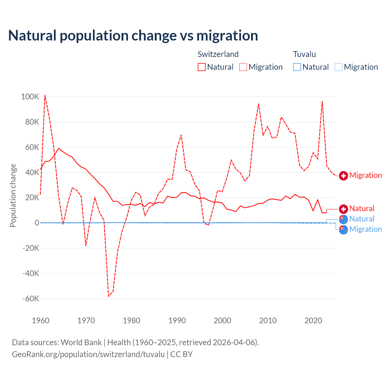 Over the last 10 years, 21.6% of the population change in Switzerland is from natural causes (a gain of 165,354 people) and 78.4% is from migration (a gain of 600,145 people). In Tuvalu 35.5% is from natural causes (a gain of 1,556 people) and 64.5% is from migration (a loss of 2,827 people).