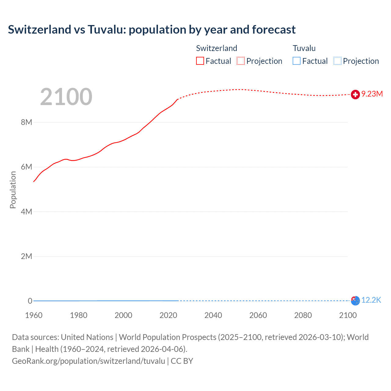 The latest officially reported population of Switzerland was 9,005,582 in 2024 vs 9,646 people in Tuvalu in 2024. In 2026, based on the adjusted UN estimation, the current Switzerland's population is 9,107,866 people compared to 9,341 in Tuvalu.